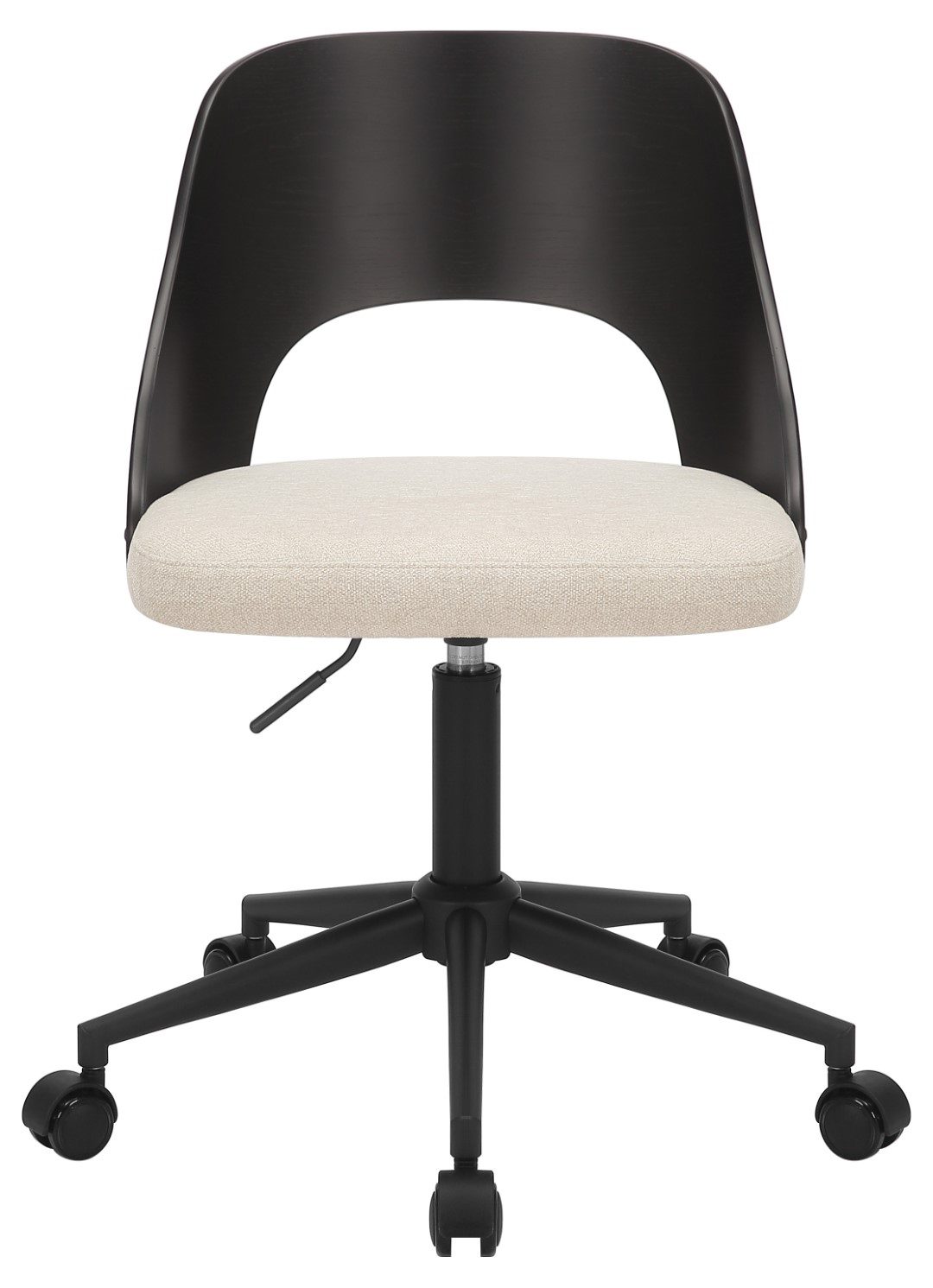 Zaprojektowane, by zachwycać. Krzesło do biurka Lucy z regulacją wysokości łączy w sobie styl i funkcjonalność. Lakierowane na czarno oparcie z forniru dębowego posiada delikatne wycięcie, a siedzisko z beżowego szenilowego obicia przemawia do zmysłów miękką strukturą. Dla łatwiejszego przemieszczania krzesło posiada czarną 5-gwiazdkową obrotową podstawę z kółkami z miękkim hamulcem. Krzesło do biurka Lucy, tkanina Apia w kolorze beżowym 453 i fornir dębowy lakierowany WB na czarno, podstawa 5-gwiazdkowa z matowej, czarnej, szorstkiej stali malowanej proszkowo z podnośnikiem gazowym, kółkami z miękkim hamulcem i mozliwością obrotu.Wysokość oparcia 39 cmSzerokość siedziska 45 cmGłębokość siedziska 44 cmWysokość siedziska maks. 59,5 cmWysokość siedziska min.47,5 cmMax. obciążenie 110kgWaga fotela: 7,2kg