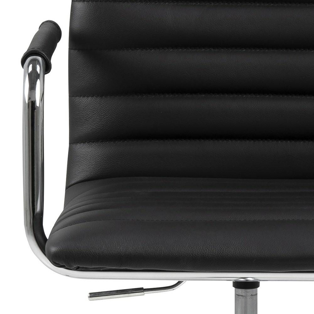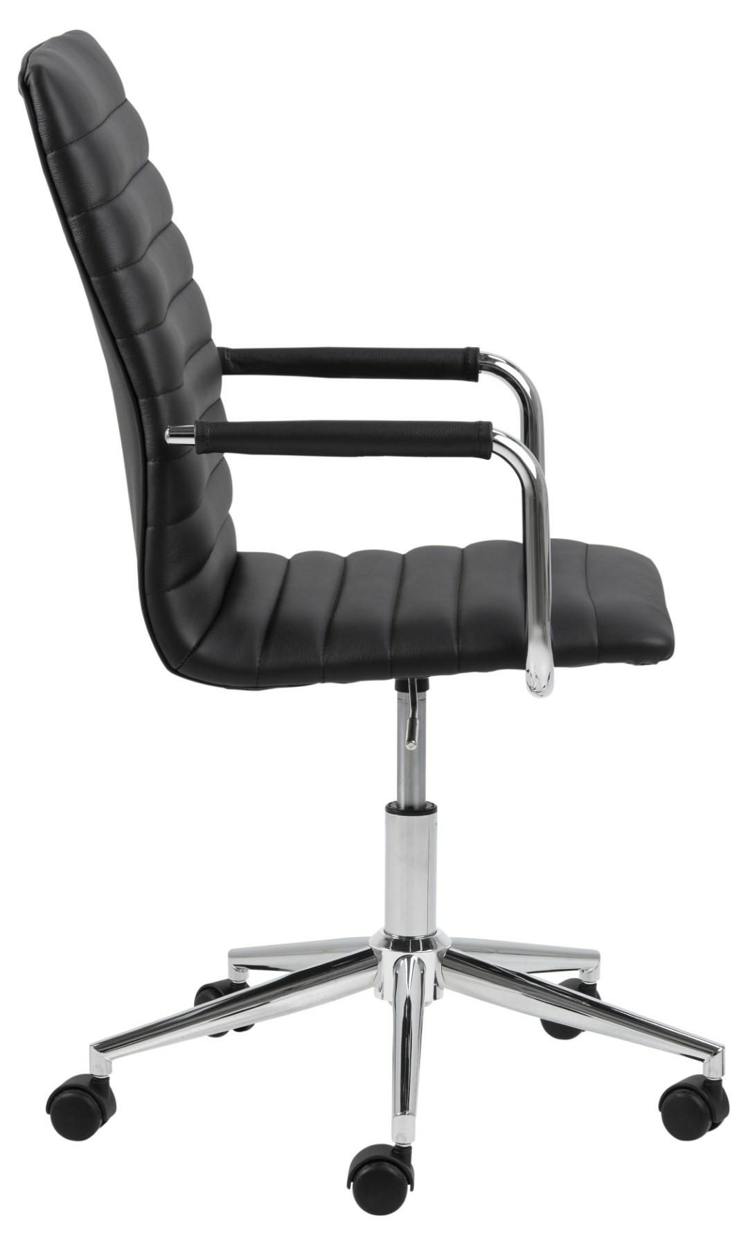Fotel biurowy Winslow to wygodny obrotowy fotel z podłokietnikami. Siedzisko oraz oparcie krzesła zostało obite miękką czarną skórą. Poziome regularne przeszycia na fotelu dodają mu nowoczesnego wyglądu. Podłokietniki fotela również zostały obite skórą. Chromowana podstawa fotela wyposażona została w pięć obrotowych kółek. Fotel posiada regulację wysokości. Fotel posiada opcję automatycznego blokowania się kółek. Opcja ta polega, iż w momencie, gdy na fotelu nikt nie siedzi, utrudnione jest przesunięcie fotela, natomiast w momencie, gdy na nim siedzimy kółeczka obracają się delikatnie i płynnie.Max. obciążenie: 120 kgMax. ilość sztuk w kartonie: 1Wymiary kartonu: 68 cm x 59 cm x 48 cmWysokość siedziska: 52 cmSzerokość siedziska: 44,5 cmGłębokość siedziska: 42 cmWysokość podłokietników: 20 cm