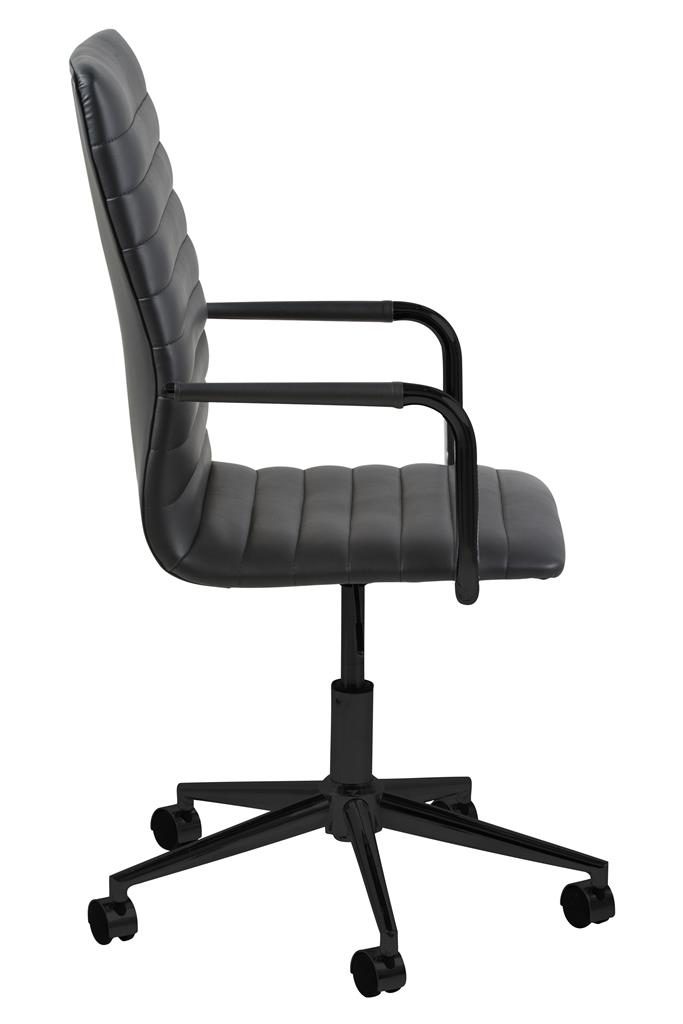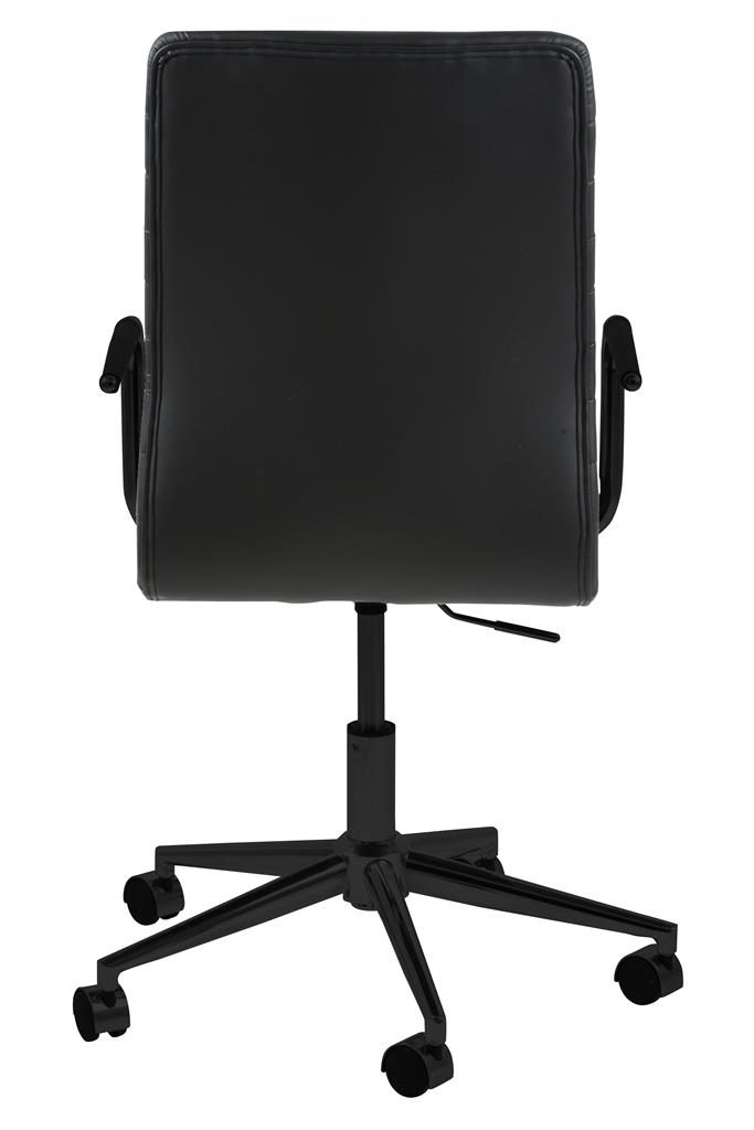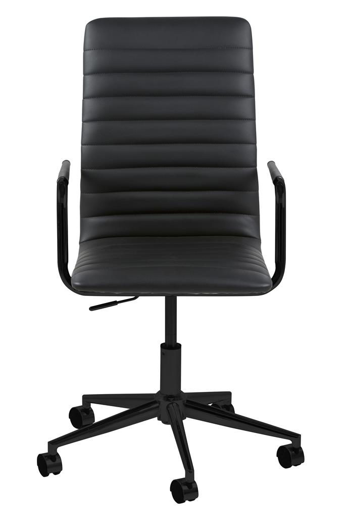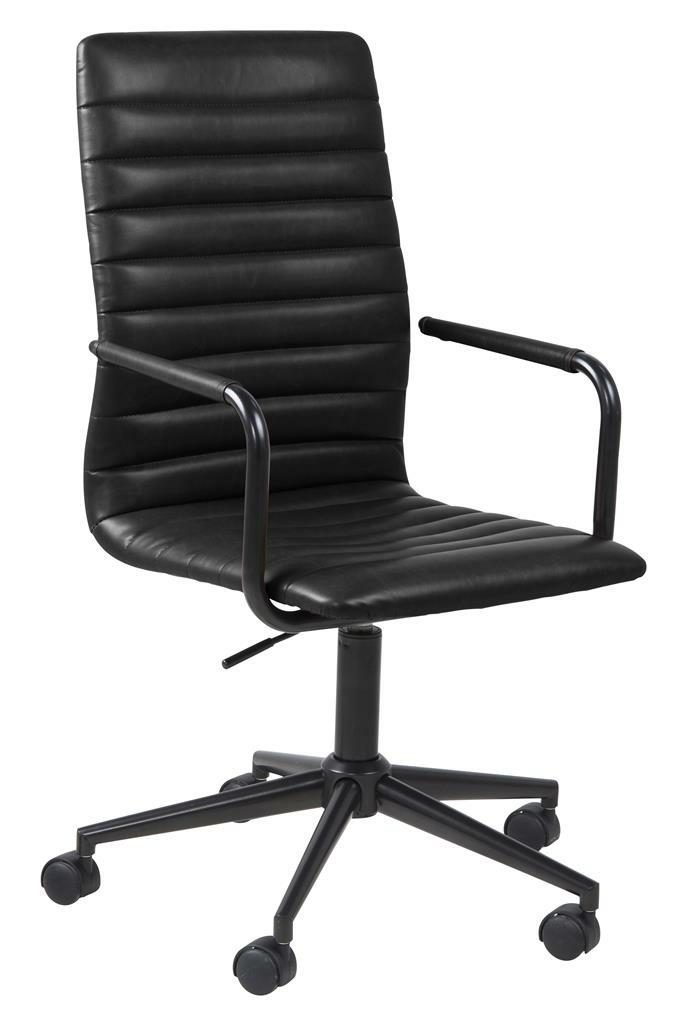 Fotel biurowy Winslow to wygodny obrotowy fotel z podłokietnikami. Siedzisko oraz oparcie krzesła zostało obite miękką czarną skórą. Poziome regularne przeszycia na fotelu dodają mu nowoczesnego wyglądu. Podłokietniki fotela również zostały obite skórą. Chromowana podstawa fotela wyposażona została w pięć obrotowych kółek. Fotel posiada regulację wysokości. Fotel posiada opcję automatycznego blokowania się kółek. Opcja ta polega, iż w momencie, gdy na fotelu nikt nie siedzi, utrudnione jest przesunięcie fotela, natomiast w momencie, gdy na nim siedzimy kółeczka obracają się delikatnie i płynnie.Max. obciążenie: 120 kgMax. ilość sztuk w kartonie: 1Wymiary kartonu: 68 cm x 59 cm x 48 cmWysokość siedziska: 52 cmSzerokość siedziska: 44,5 cmGłębokość siedziska: 42 cmWysokość podłokietników: 20 cm