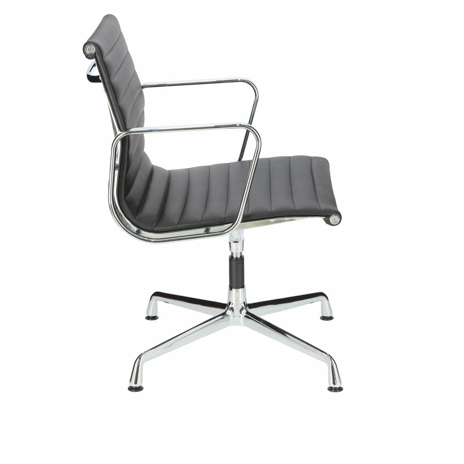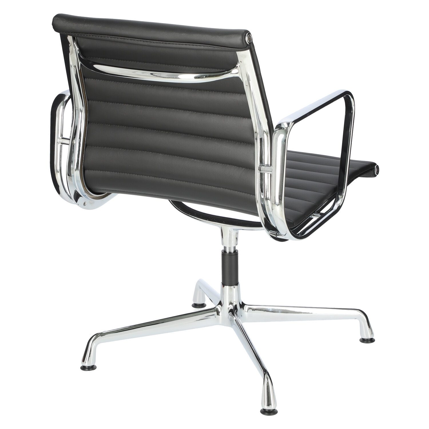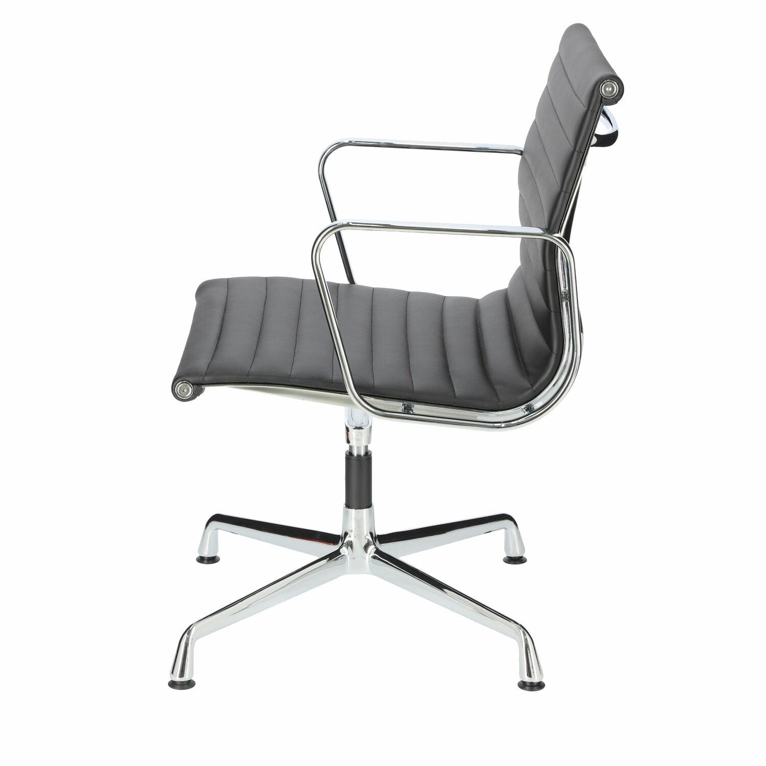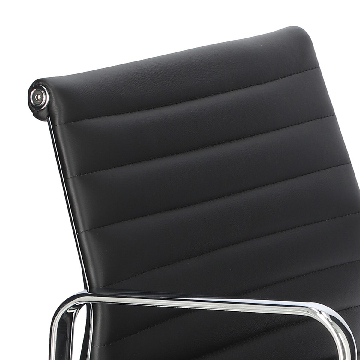 Fotel konferencyjny to nieodzowny element każdej sali konferencyjnej. Fotel CH1081T to przede wszystkim wysoka jakość wykonania oraz ponadczasowy design. Głównym założeniem tego fotela była lekkość formy i wygoda użytkownika. Dlatego materiał, na którym się siedzi jest zawieszony w powietrzu między dwoma metalowymi profilami. Siedzisko zostało zrobione ze skóry ekologicznej w czarnym kolorze. Poziome przeszycia na siedzisku dodają fotelowi klasyczny wygląd. Chromowane elementy fotela dodają całości eleganckiego wyglądu. Obrotowa baza na nóżkach wykonana jest również z chromowanego metalu. Krzesło nie posiada mechanizmu regulacji wysokości.