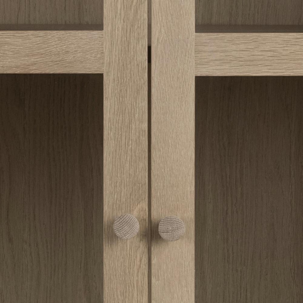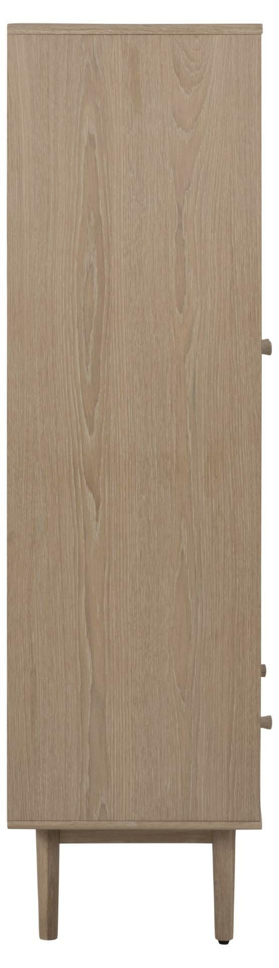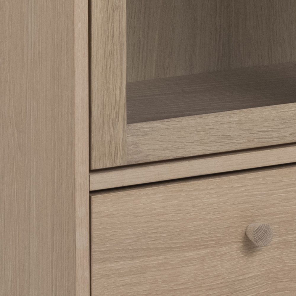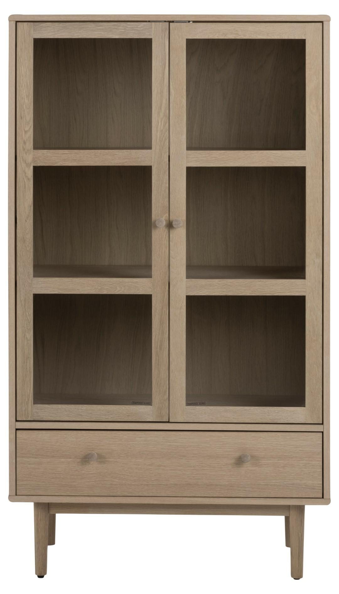 Witryna Aston to piękny dębowy mebel, w którym przechowamy zastawę stołową lub obrusy. Gablota z płyty wiórowej wykończona została bielonym fornirem z drewna dębowego. Zabezpieczenie forniru olejem nie tylko nie zmienia koloru drewna, ale uwydatnia naturalne słoje i strukturę. Nogi kredensu to z kolei lite drewno dębu, które również zostało poddane olejowaniu. Kredens Aston to klasyczny skandynawski design, a zarazem mebel, który gwarantuje dużo miejsca do przechowywania na półkach i w szufladach. Każda z półek ma regulowaną wysokość i możemy ustawiań na niej przedmioty aż do 15 kg.Waga komody: 45 kgWymiary opakowania:1) 85×46,5×17 cm2) 127,7x45x10,2 cm