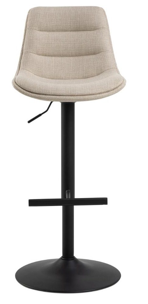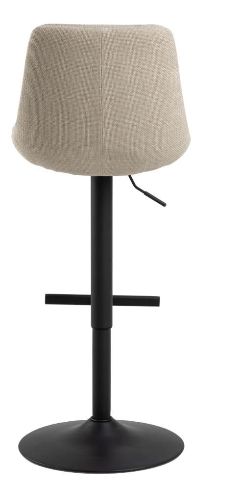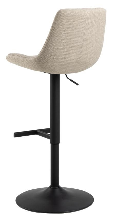 Hoker Adisa to nowoczesny stołek barowy na jednej czarnej nodze zakończonej okrągłą podstawą. Hoker wyposażony został w metalowy podnóżek ułatwiający zarówno siadanie na stołku jak i podpieranie stóp podczas siedzenia. Stołek wykonany z metalu, płyty MDF obitej grubą pianką tapicerską oraz tkaniną Basel beige 24. Tkanina o grubym splocie sprawdzi się we wnętrzach o naturalnym wyglądzie, np. japandi.Wysokość oparcia:30 cm, Szerokość siedziska:46 cm, Głębokość siedziska: 38 cm, Wysokość siedziska maks.86 cm, Wysokość siedziska min.65 cmMax. obciążenie 120kg.Wymiary kartonu: 57x55x50cm. Waga: 10kg. Stołek wymaga montażu.