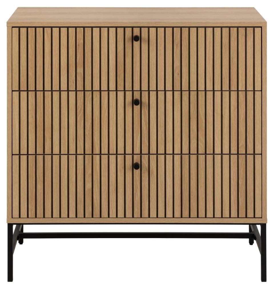 Komoda o dębowym wyglądzie z lamelowym frontem wie, jak przyciągnąć uwagę. Kontrastowy, dębowy wygląd uzupełniony czarnymi akcentami tworzy dobrze wyważony efekt wizualny. Dzięki 3 szufladom komoda oferuje dużo miejsca do przechowywania, a łatwa w pielęgnacji powierzchnia zwiększa jej praktyczność. Główne cechy: Komoda z szufladami z frontem lamelowym . Wyposażona w 3 szuflady zapewniających dużo miejsca do przechowywania. Łatwa w pielęgnacji powierzchnia o wyglądzie dębu. Geometryczna podstawa wykonana ze stali malowanej proszkowo na czarno. Certyfikat FSC . Zaprojektowany przez projektanta Lasse Cha Pedersena . Wysokość nóg: 18cm Wymaga montażu. Waga mebla: 29kg. Max. obciążenie: 25 kg Wymiary kartonów: 88×47,5×10,5cm waga 13,4kg, 93x50x10,2cm, waga 16,8kg