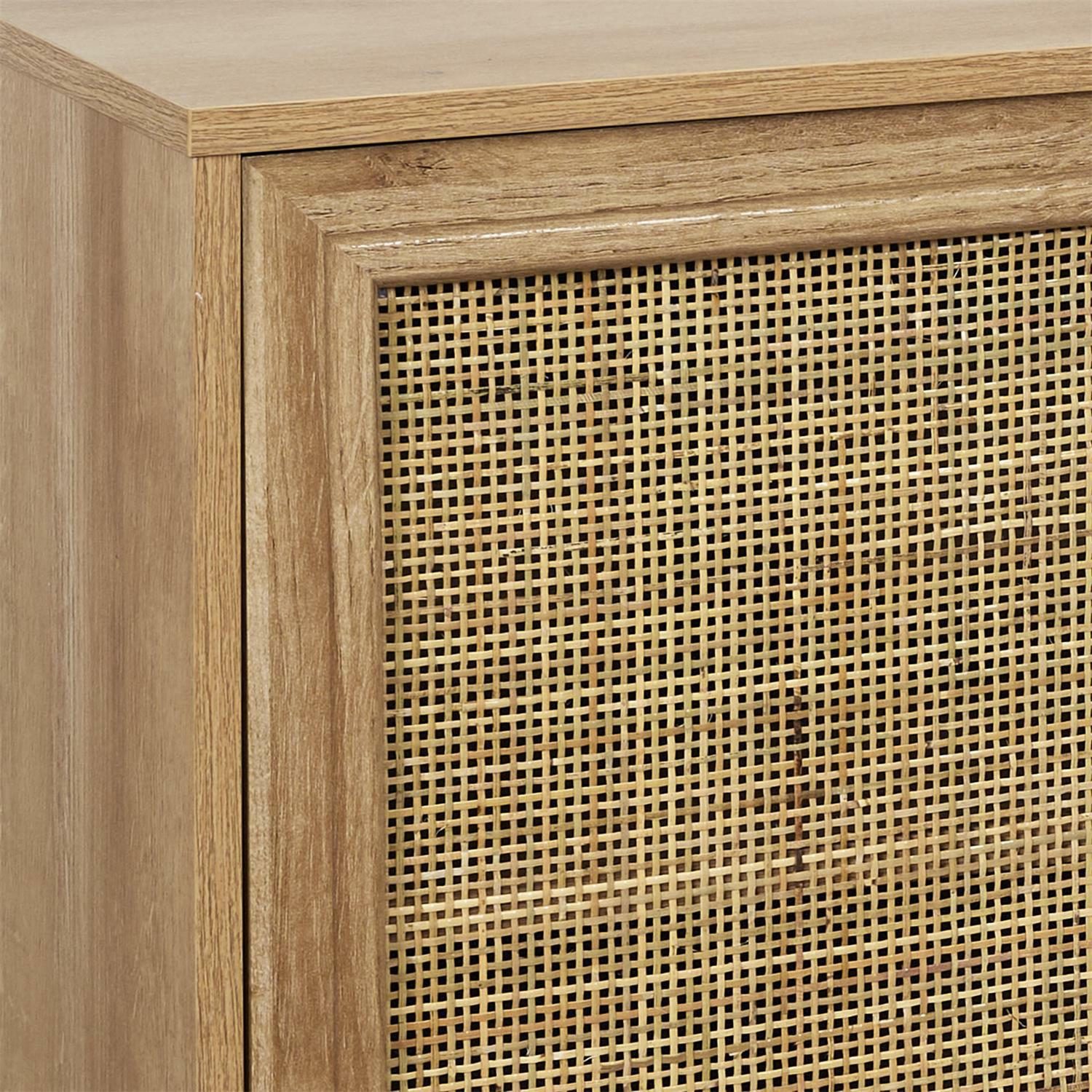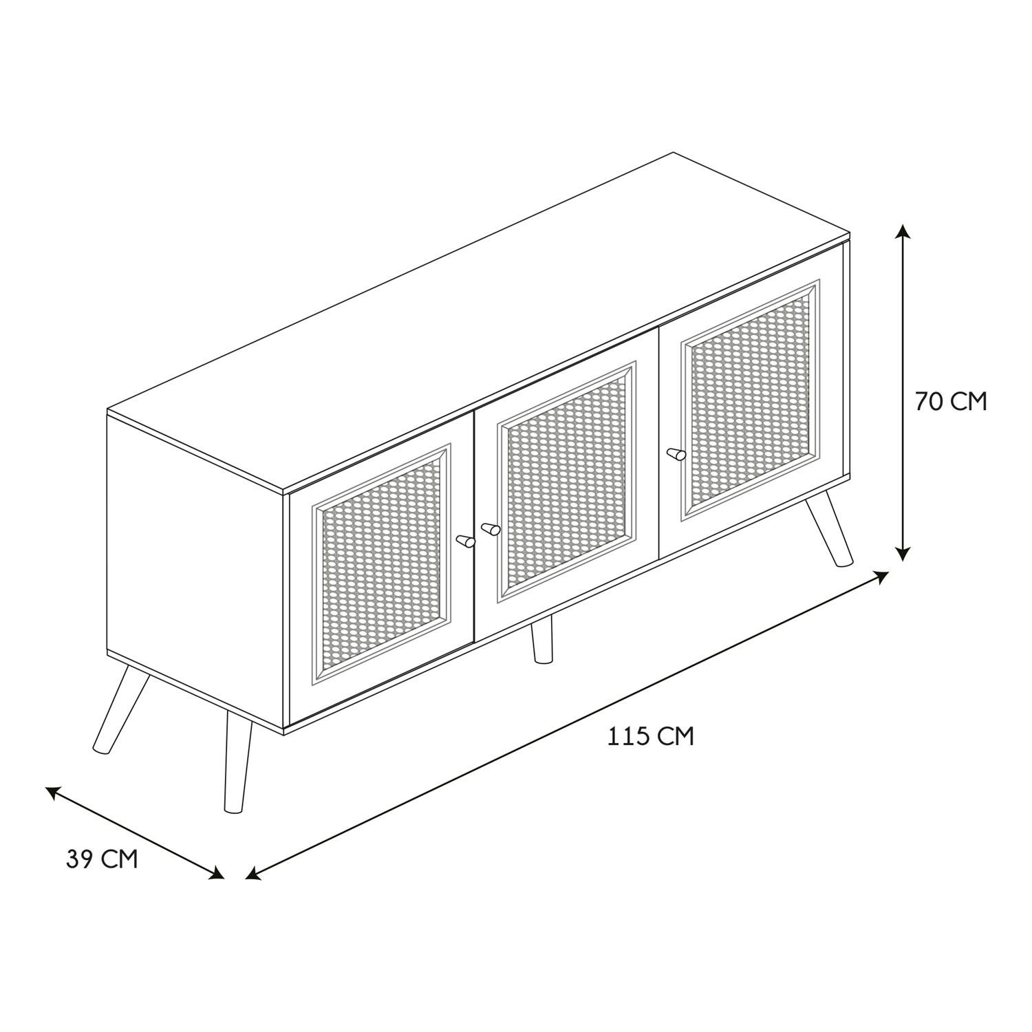 Trzydrzwiowa komoda Bali to mebel z plecionymi frontami szafki w stylu boho. Podstawą komody jest 5 nóg, które dzięki swojej budowie gwarantują stabilizację. Dodatkowa piąta noga podpiera komodę pośrodku, dzięki czemu możemy śmiało ułożyć w niej ciężką porcelanę lub sztućce. Trzydrzwiowa niska komoda Bali będzie najpiękniejszym meblem w Twoim wnętrzu! – Główny skład: płyta wiórowa. Wymiary opakowania: 10,6x42x120 cm Mebel wymaga samodzielnego montażu