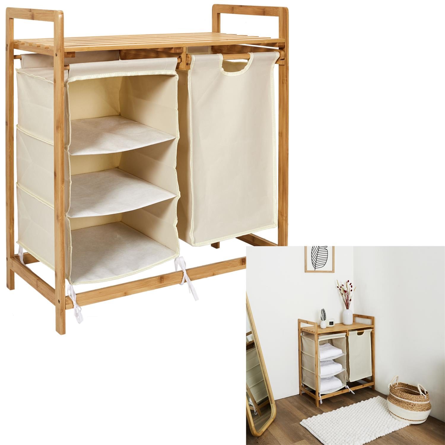 Komoda idealna do porządkowania prania oraz ręczników. Komoda sprawdzi się nie tylko w pralni czy łazience w stylu naturalnym. Może ona służyć jako miejsce do organizowania ręczników w salonie masażu lub w SPA. Wykonana z bambusowej ramy komoda wyposazona jest w 3 półki z tkaniny bawełnianej oraz sporej szuflady również z materiału. Wiewrzch komody wykończomny został drewnianym blatem. Komoda wymaga montażu. Max. obciążenie na półkę 3kg.
