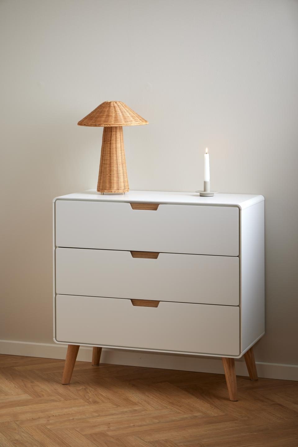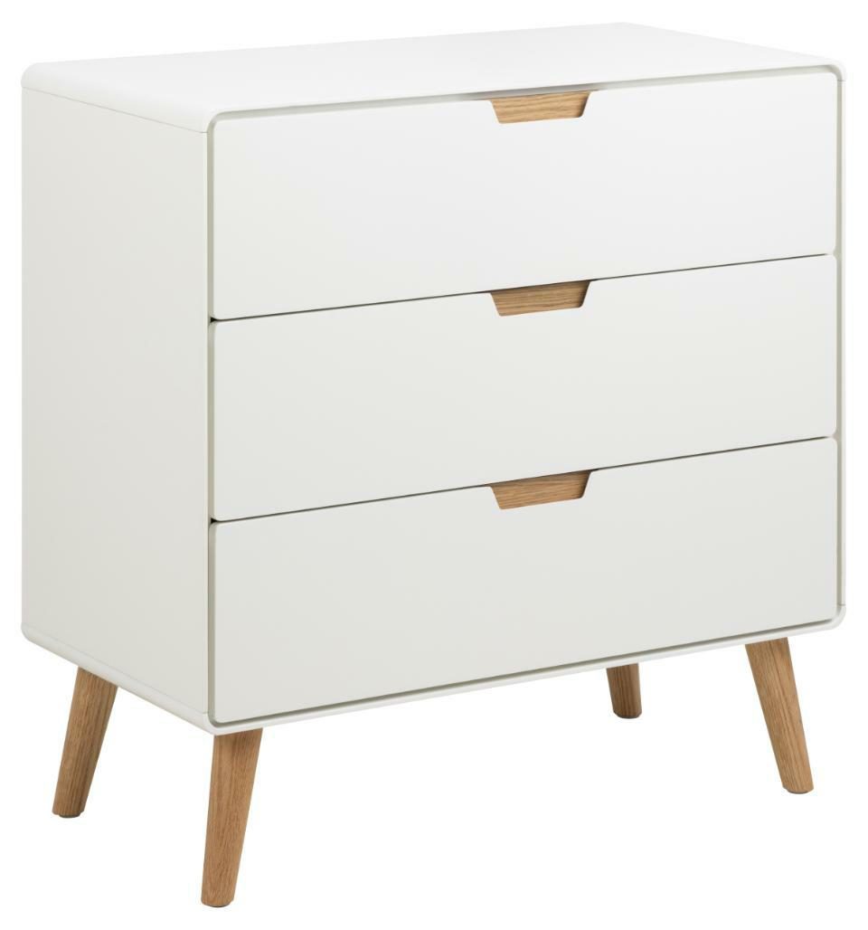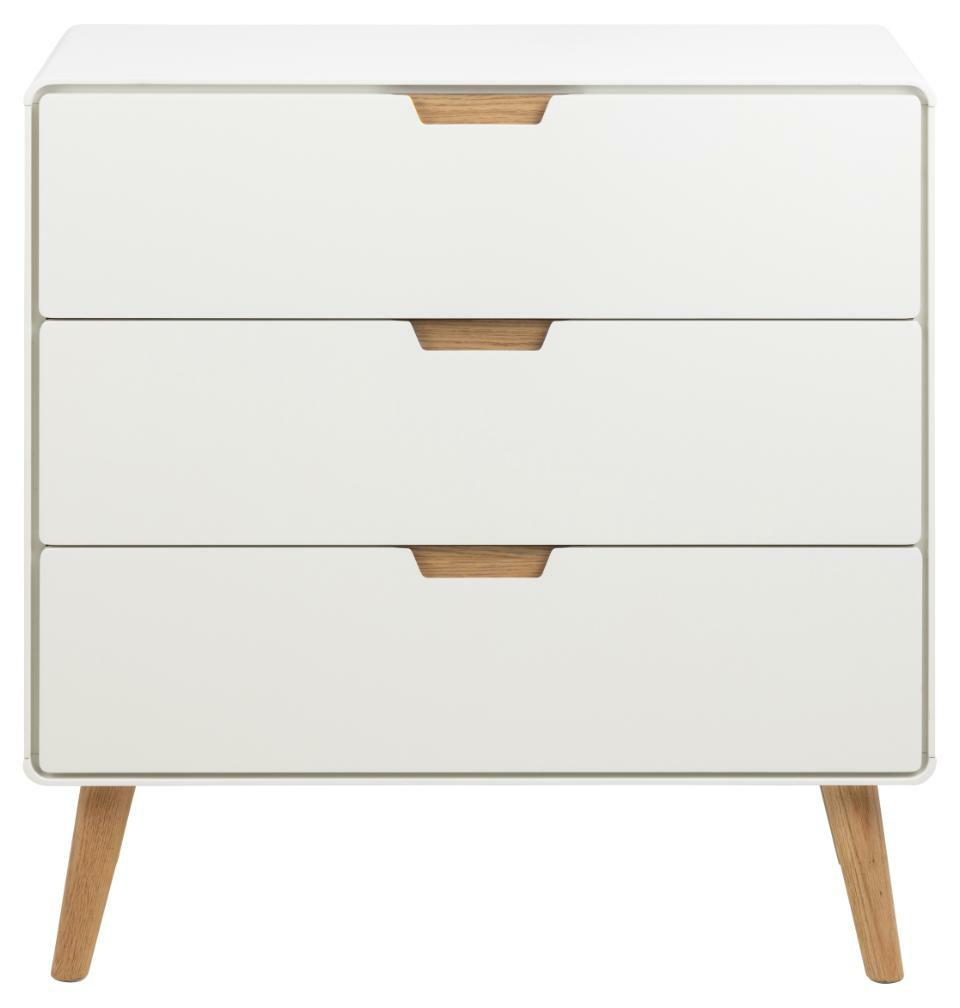 Przestronna komoda Lowell z 3 szufladami zapewnia dużo miejsca do przechowywania ubrań, zabawek i książek. Pomalowana na biało szuflada będzie pasować do niemal każdego pomieszczenia dzięki swojemu minimalistycznemu wyglądowi. Dębowe detale dobrze uzupełniają ogólną estetykę. Jest to rozwiązanie do przechowywania, które bez wysiłku łączy funkcjonalność i design. Wyposażona w 3 szuflady z cichym domykiem . Pomalowane na biało szuflady z dębowymi uchwytami .Stożkowe dębowe nogi . Certyfikat FSC. Wymaga montażu Waga komody: 34 kg. Materiał korpusu i szuflad: MDF, Materiał nóg: drewno dębowe Wysokość nóg: 17 cm Wymiary kartonu: 93,5×47,5×19,8cm