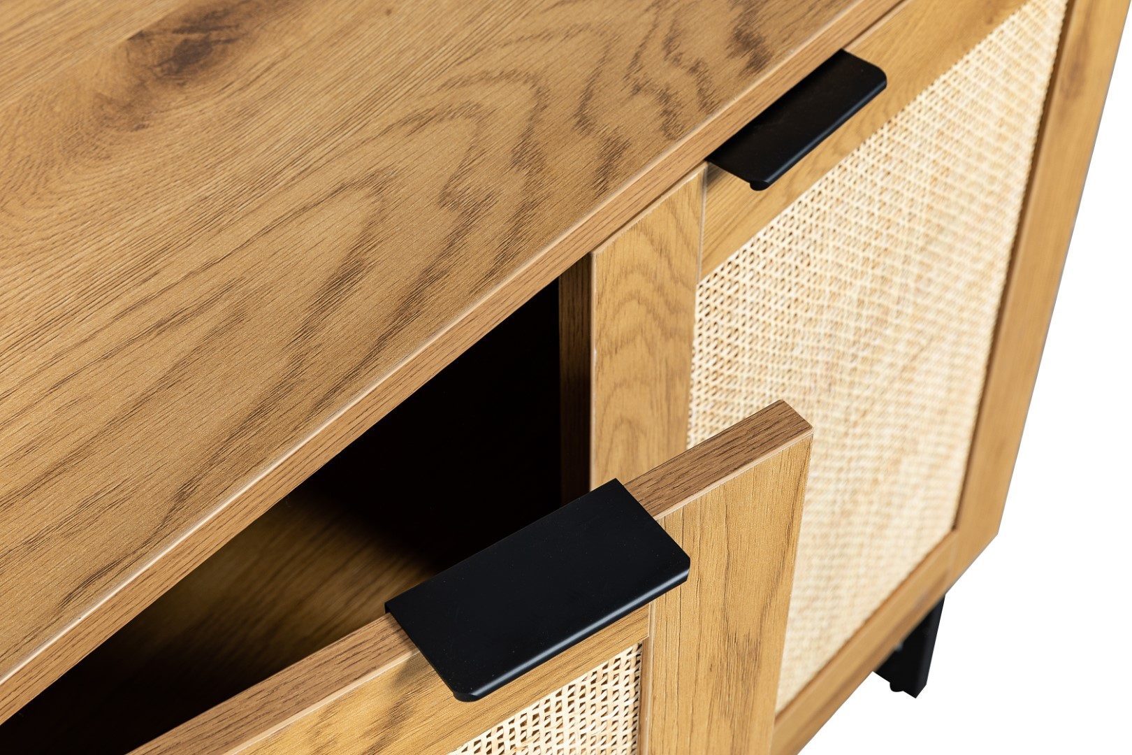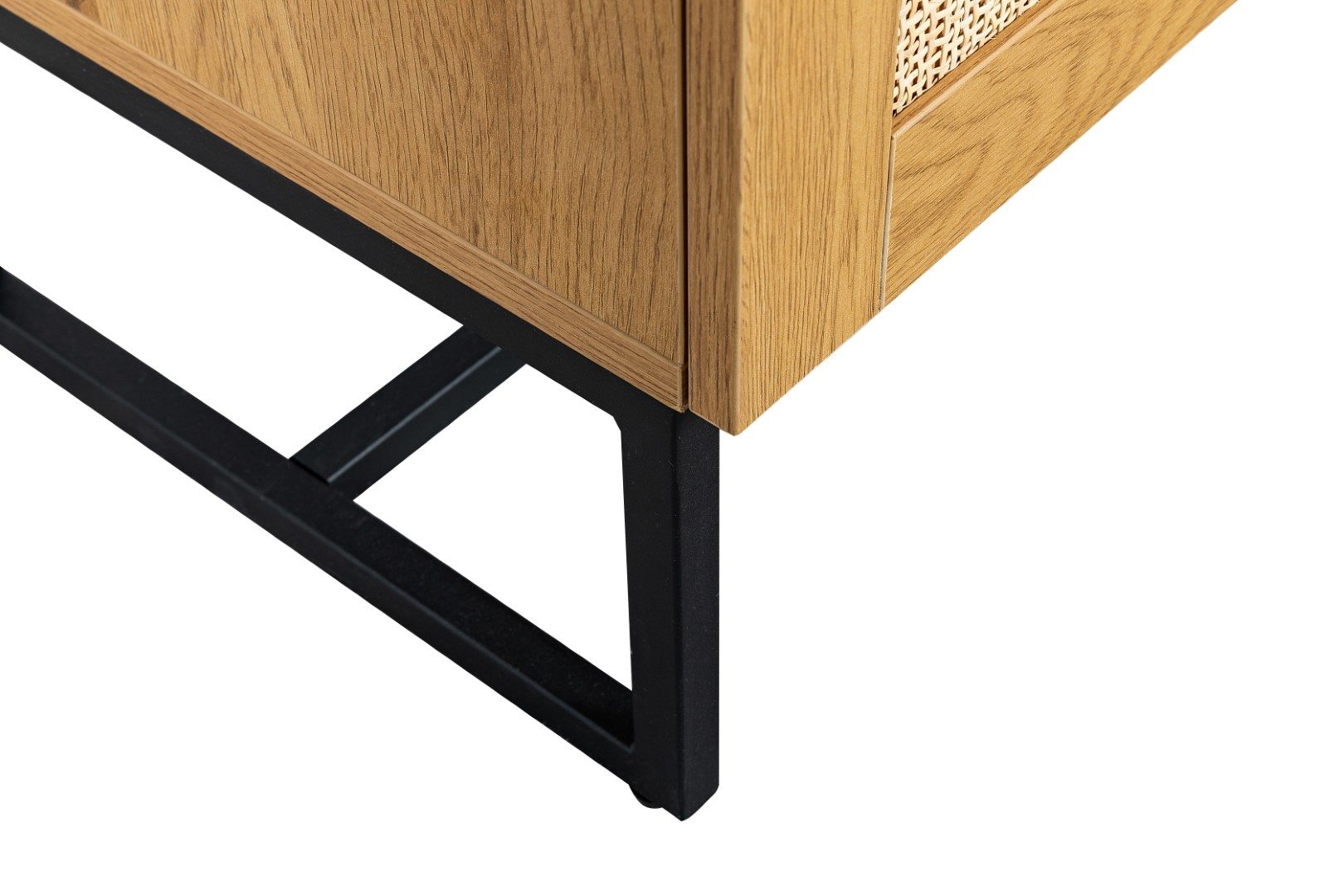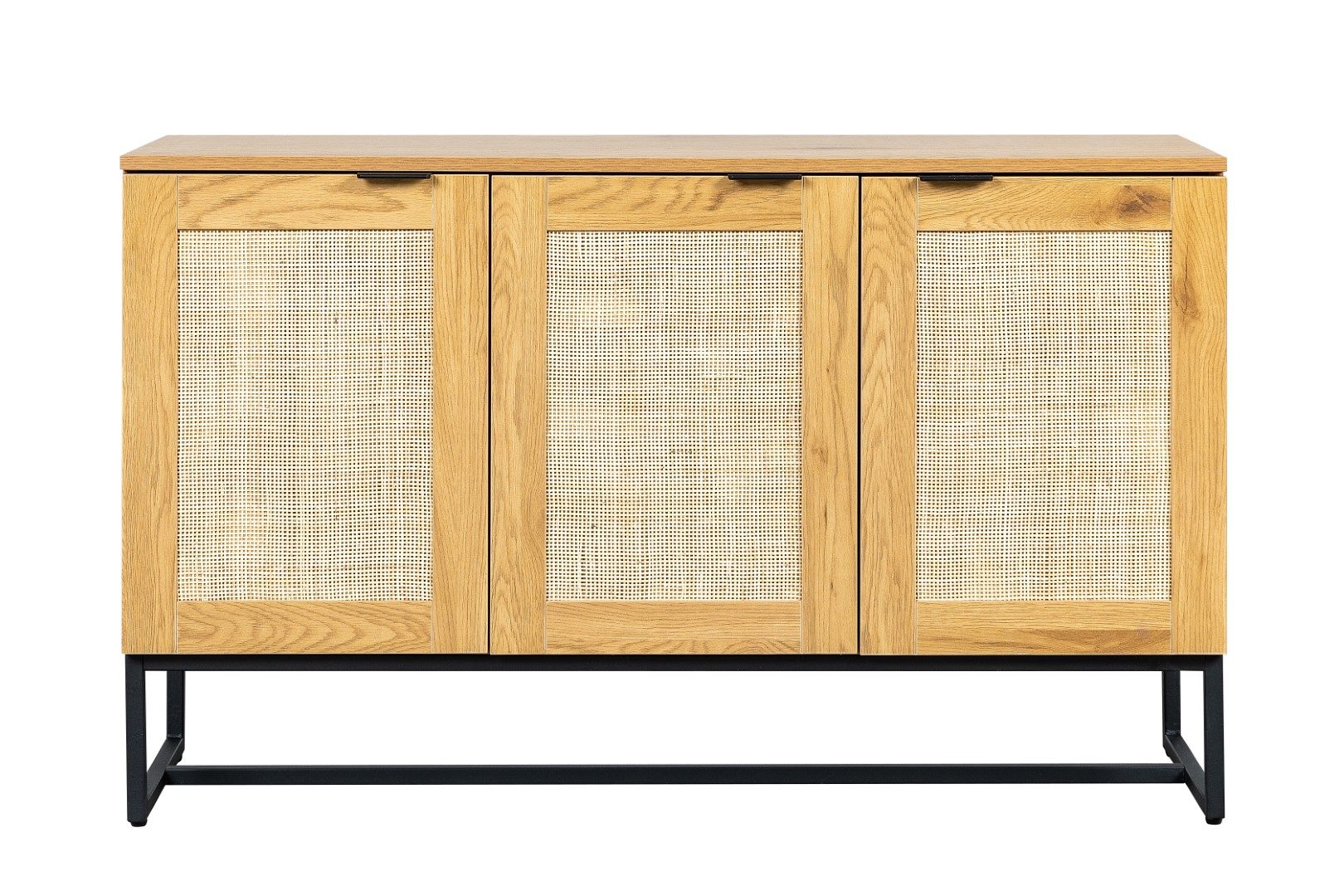 Komoda w stylu boho z rattanowymi frontami to idealny mebel do sypialni lub salonu w naturalnych, jasnych kolorach. Komoda z trzema frontami skrywa w sobie półki, na których możemy przechowywać nie tylko ubrania, ale również talerze. Komoda stoi stabilnie dzięki metalowej podstawie. Nogi komody zostały polakierowane proszkowo na czarno. Dębowa okleina, którą została wykończona szafka, niezwykle dokładnie imituje naturalny kolor oraz teksturę drewna. Swoją wytrzymałość komoda zawdzięcza trwałym materiałom jak płyta MDF, z której wykonany został korpus oraz metal użyty na podstawie. Fronty szafki w środku wykonane zostały z naturalnego rattanu. Naturalny rattan to nie tylko niewiarygodnie dobrze wyglądający materiał. Rattan przede wszystkim gwarantuje cyrkulację powietrza w komodzie.Wymiary kartonu: 130x48x15cmWaga 15kg