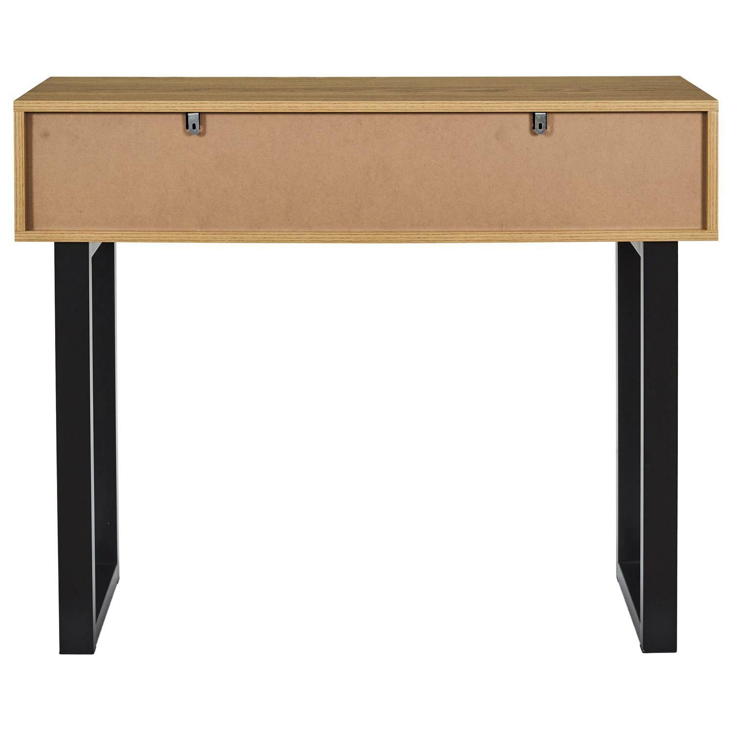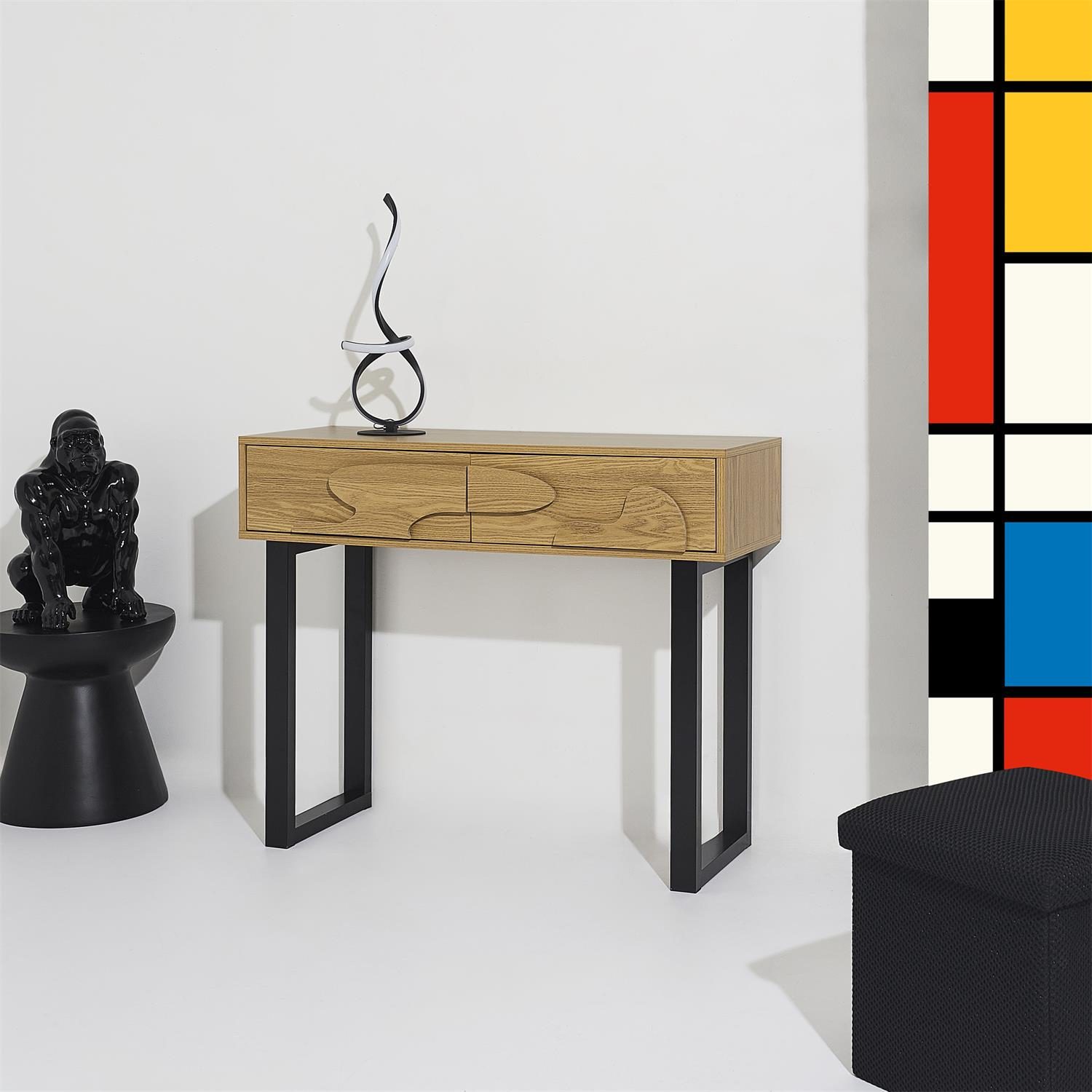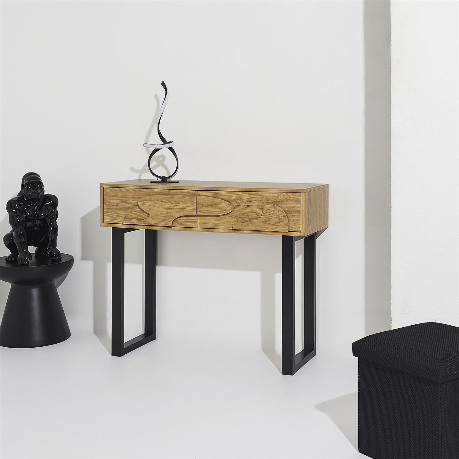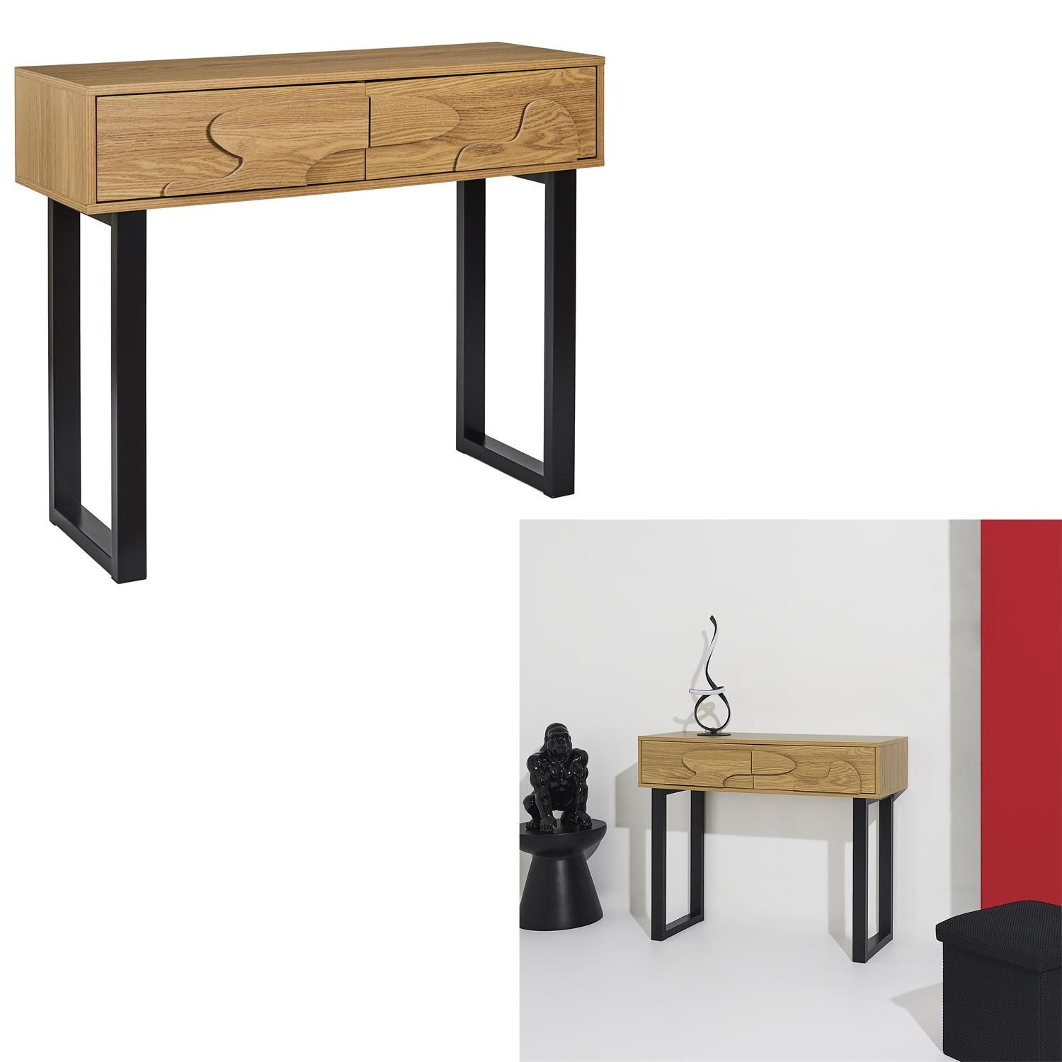 Konsola Calypso to idealny mebel do przedpokoju lub salonu w stylu Boho. Konsola Calypso wykonana została z płyty MDF w oklinie imitującej strukturę i kolor dębu. Konsola wyposażona została w dwie szuflady. Pojemne szuflady otwierają się dzięki metalowym, kulkowym prowadnicą. Podstawą konsoli są nogi w kształcie płozy. Nogi wykonane z metalu malowanego proszkowo w kolorze czarnym. Maksymalne obciążeni konsoli 40kg. Konsola wymaga montażu. Waga mebla: 18,3kg. Wymiary kartonu: 107x151x41,2cm