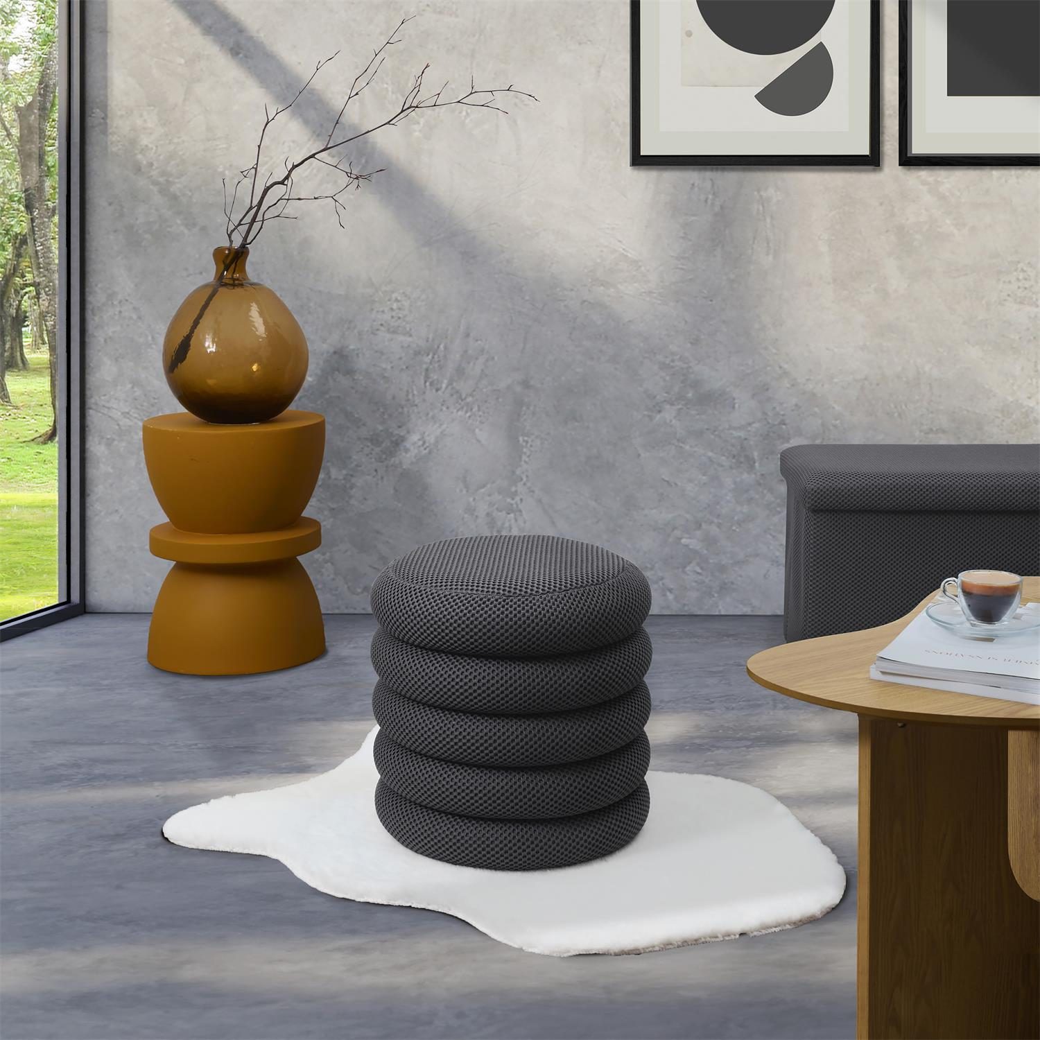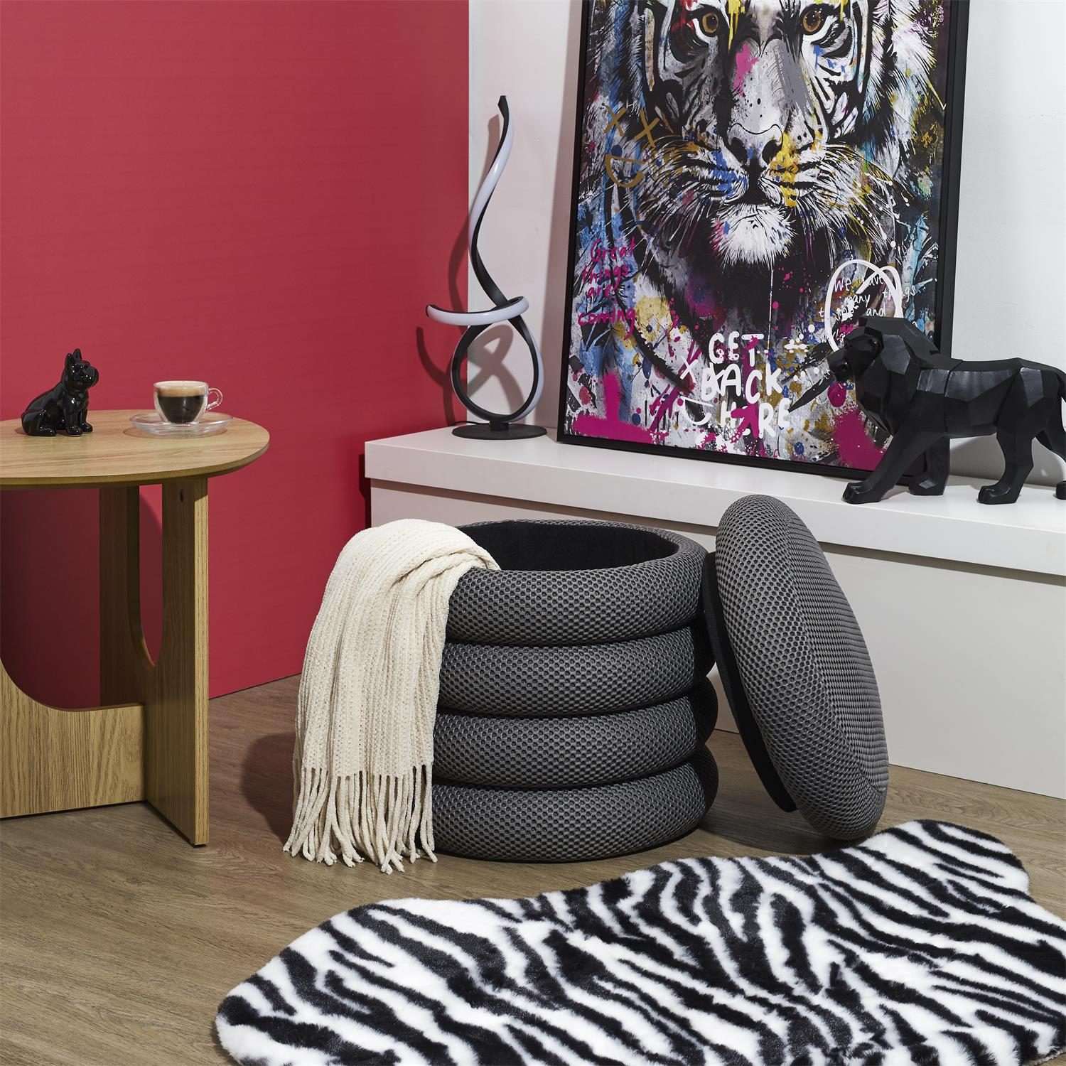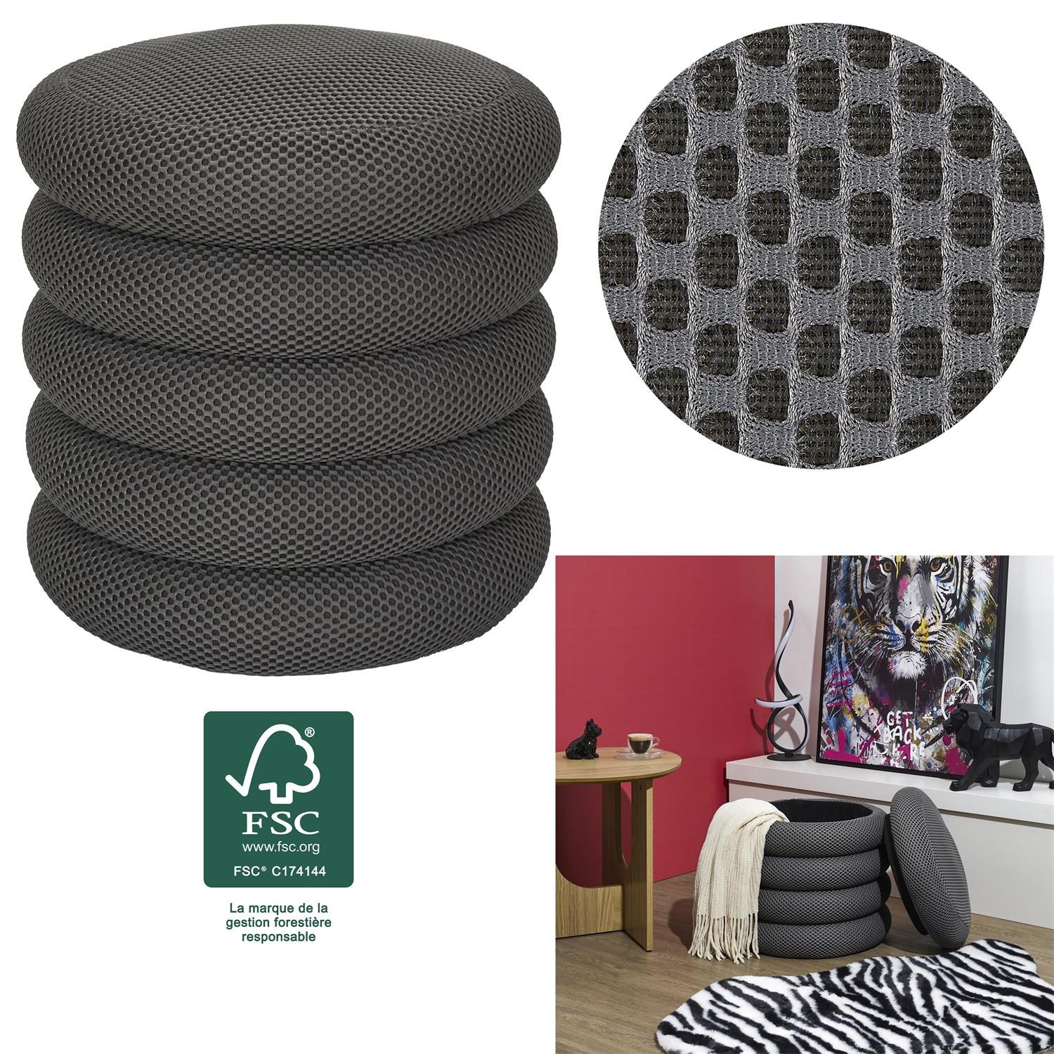 Pufa Atom to połączenie okrągłego siedziska obitego trójwymiarową tkaniną oraz minimalistycznej formy. Pufa wykonana zpłyty MDF obitej miękką pianką tapicerską. Trójwymiarowa tkanina nadaje meblowi ponadczasowego stylu. Pufa ma zdejmowaną pokrywę, dzięki czemu możemy w jej środku schować drobne przedmioty jak koc lub mała poduszka.