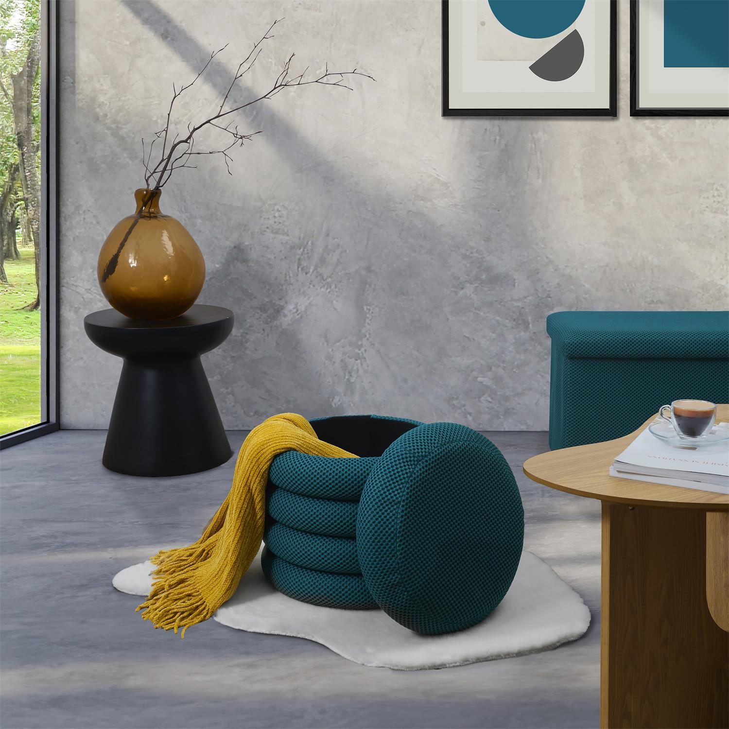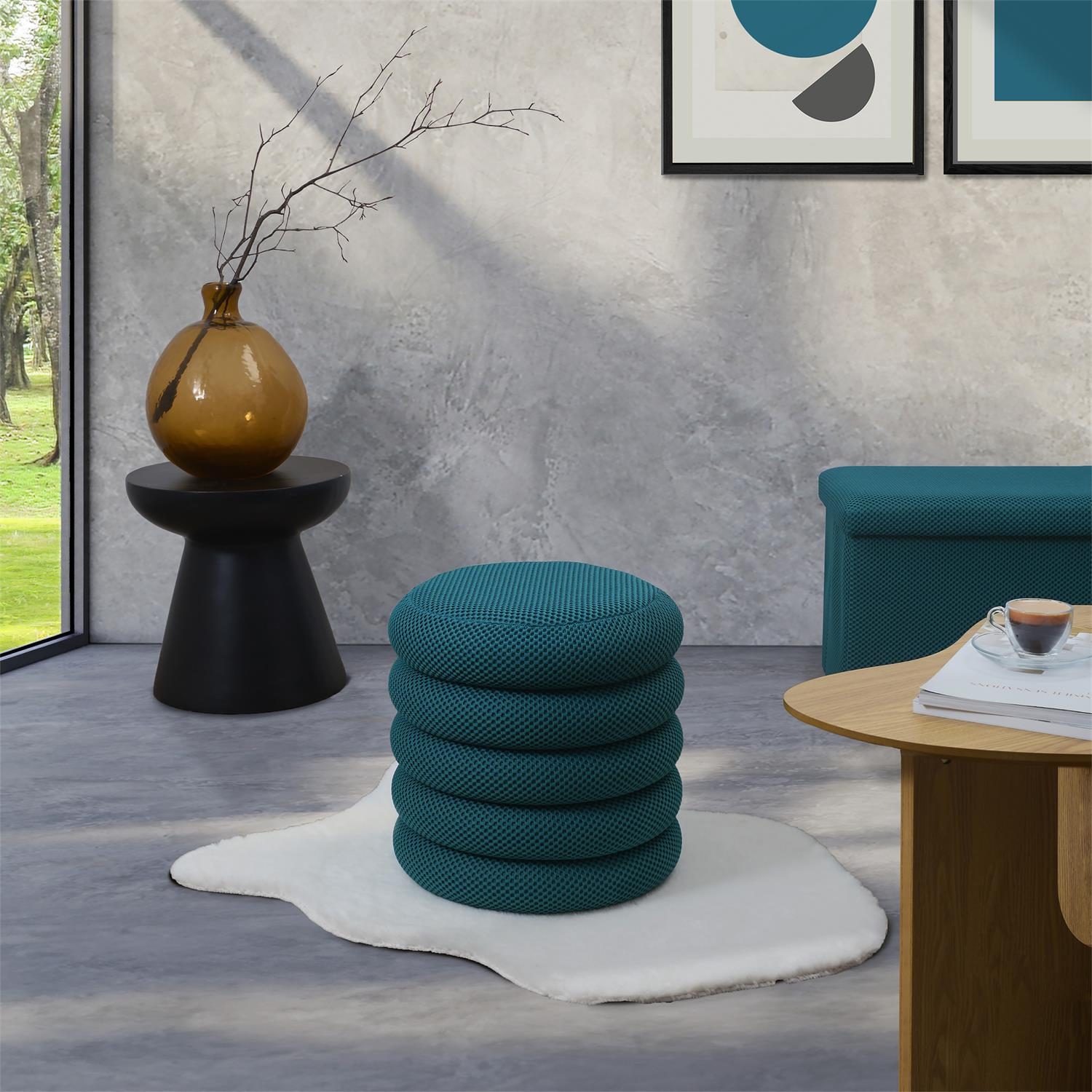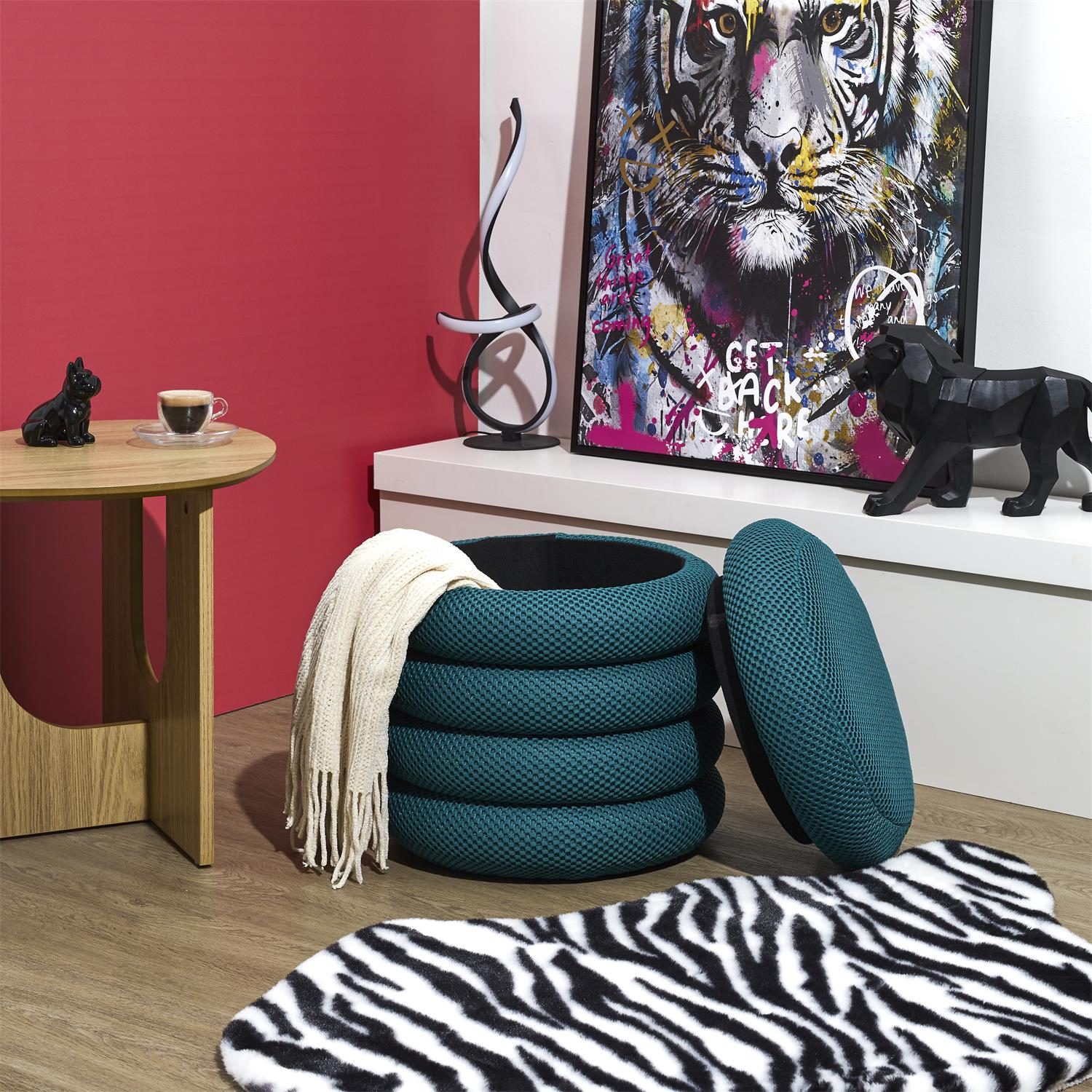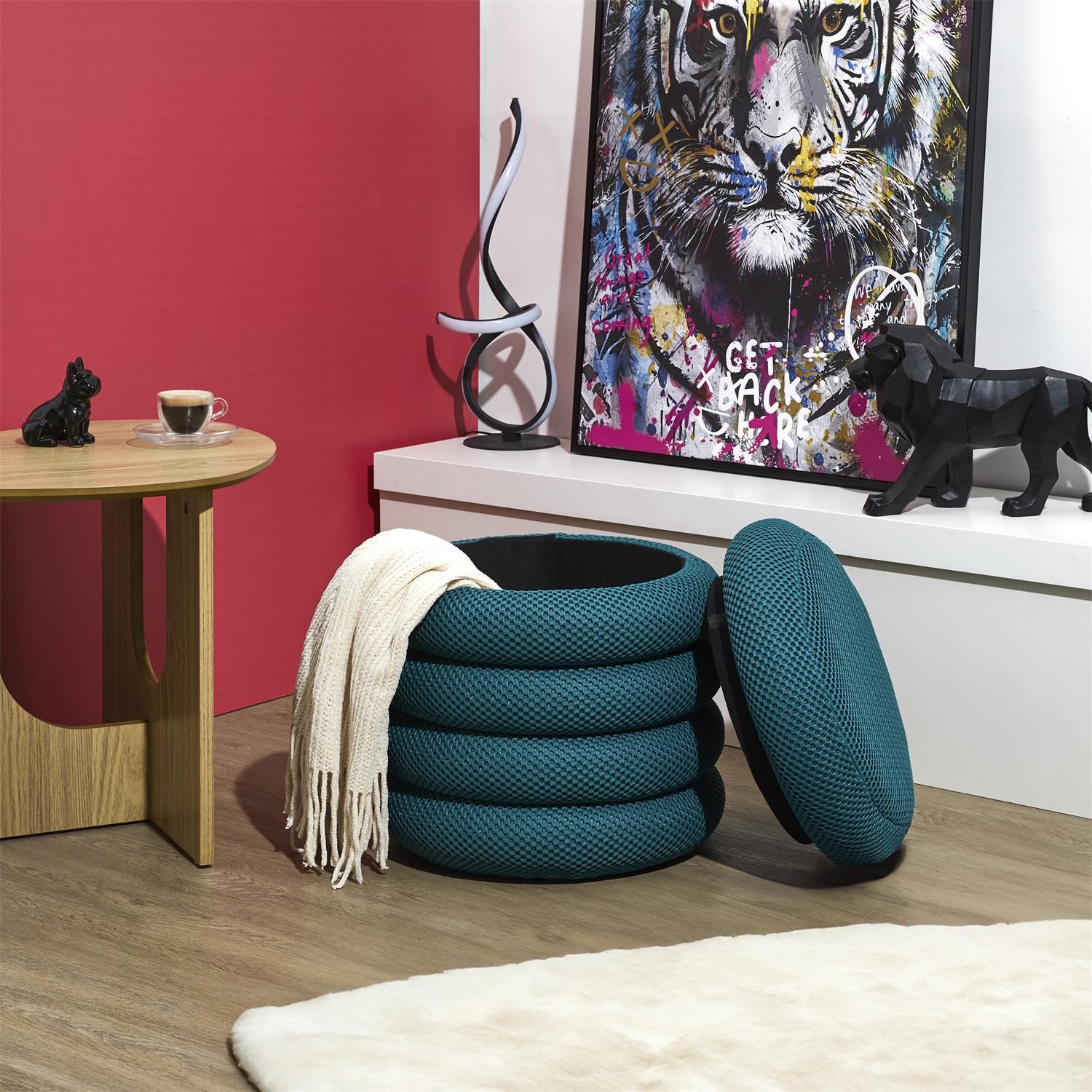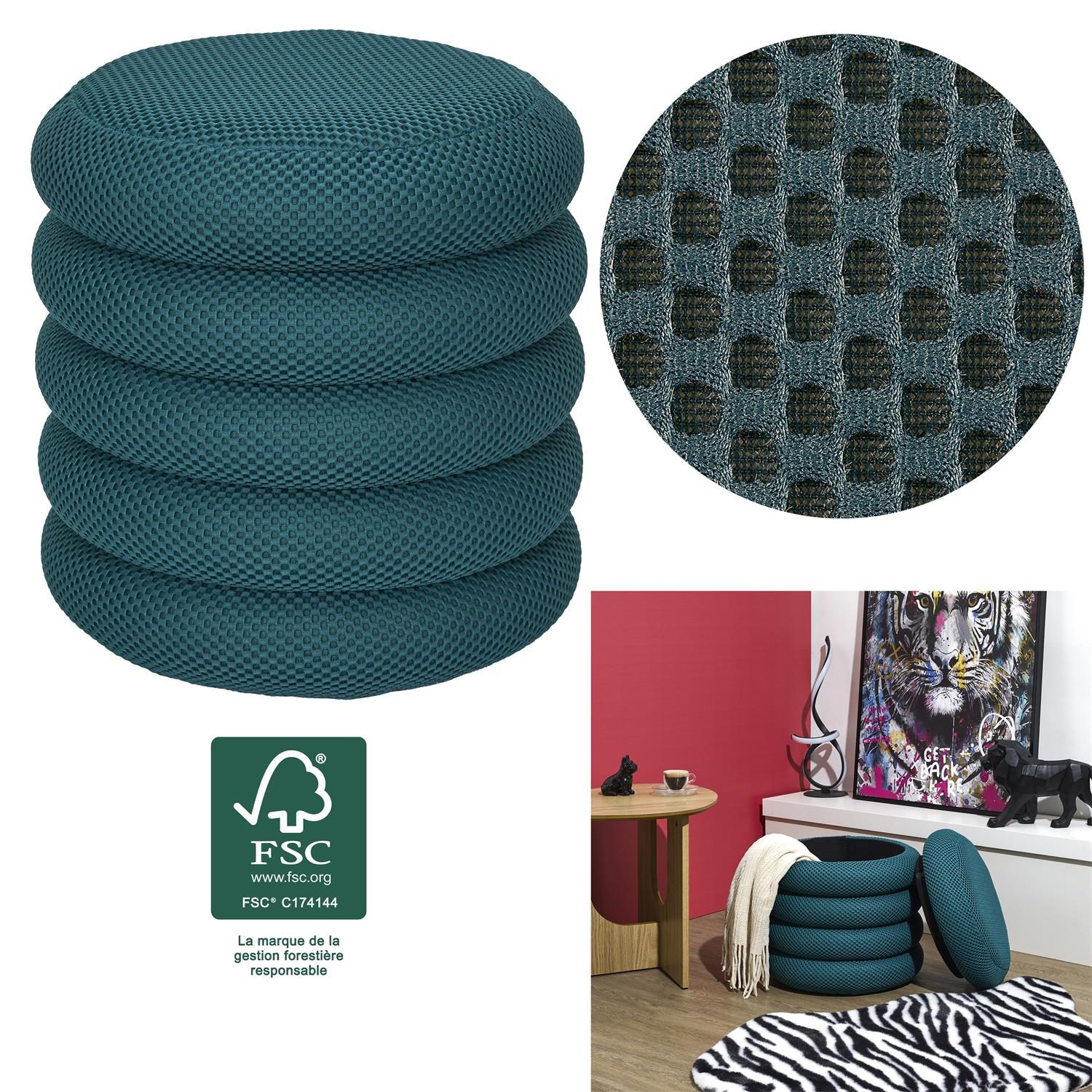 Pufa Atom to połączenie okrągłego siedziska obitego trójwymiarową tkaniną oraz minimalistycznej formy. Pufa wykonana zpłyty MDF obitej miękką pianką tapicerską. Trójwymiarowa tkanina nadaje meblowi ponadczasowego stylu. Pufa ma zdejmowaną pokrywę, dzięki czemu możemy w jej środku schować drobne przedmioty jak koc lub mała poduszka.