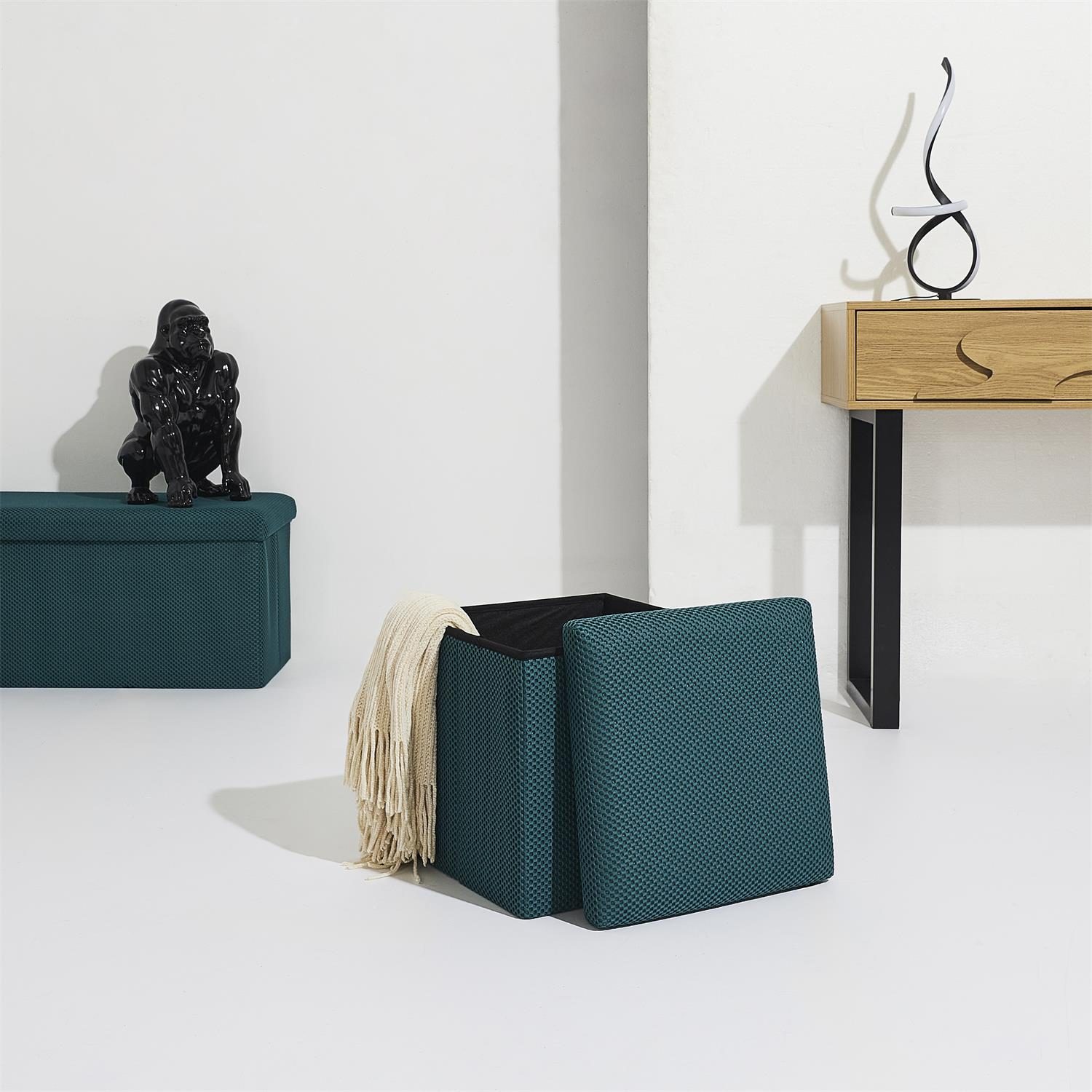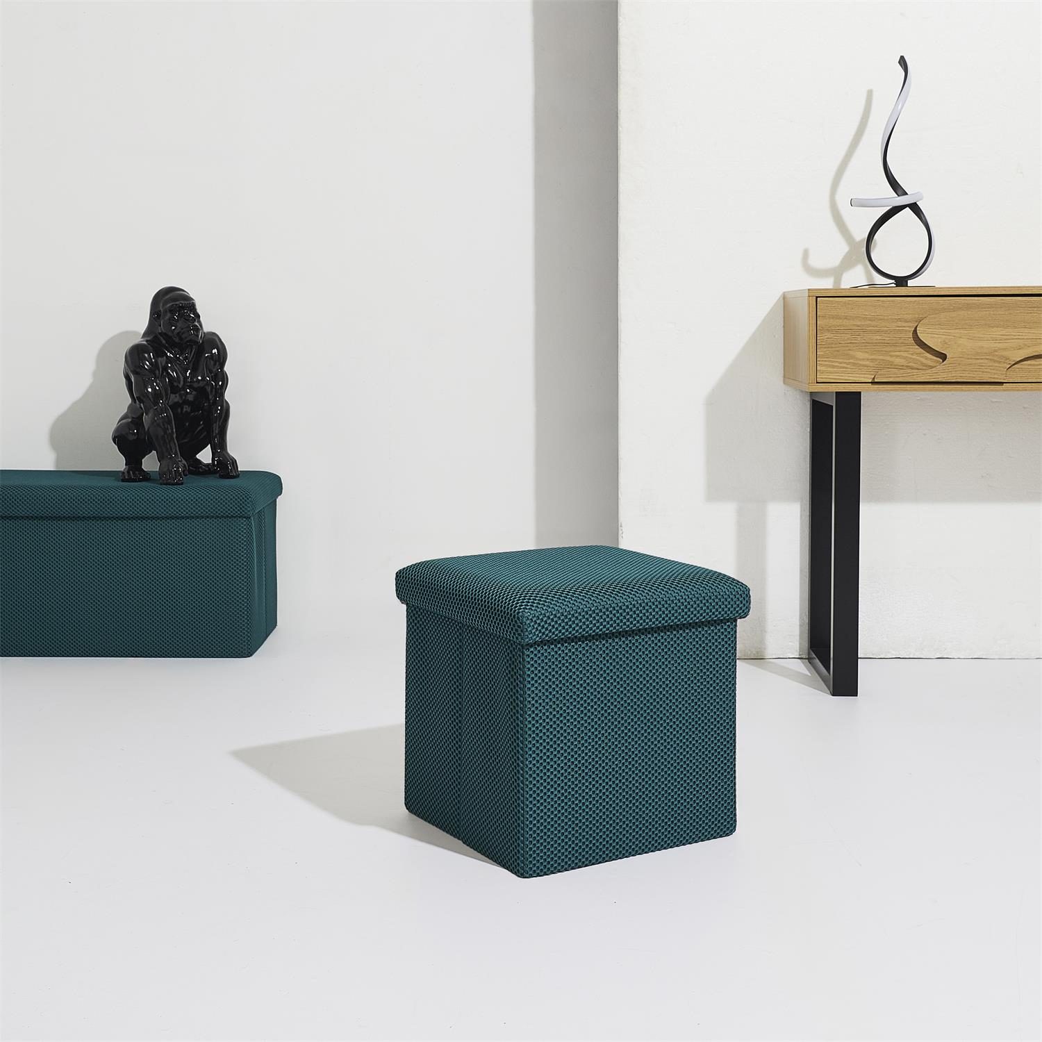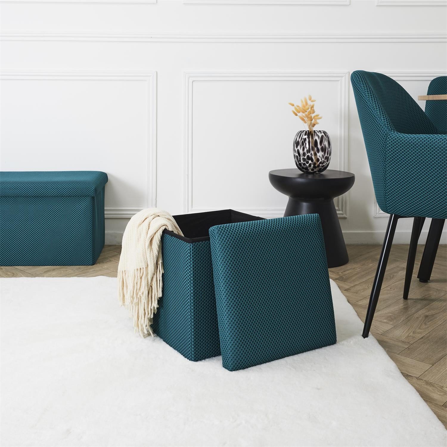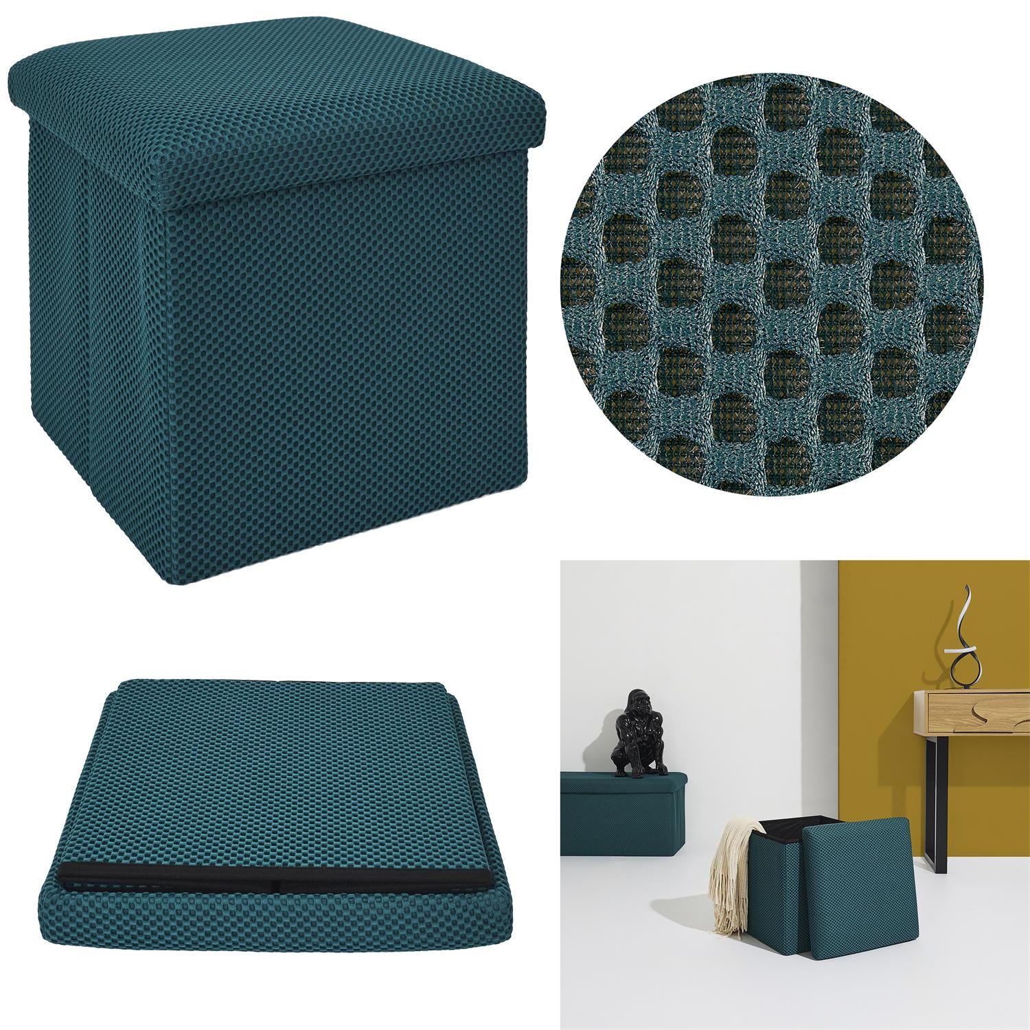 Składana pufa ze schowkiem to must have każdego mieszkania studenta lub osób, które potrzebują dodatkowego siedziska oraz miejsca do przechowywania. Pufa wykonana ze stelaża z wytrzymałej płyty MDF, która gwarantuje maksymalne dopuszczalne obciążenie mebla aż do 110kg. Pufę można złożyć gdy jej nie używamy. Po rozłożeniu natomiast daje nam sporo miejsca do przechowywania zarówno mniejszych rzeczy jak i sporych takich jak koce, buty lub książki. Pufa ozdobiona została ciekawą trójwymiarową tkaniną. Tkanina 100% poliester.