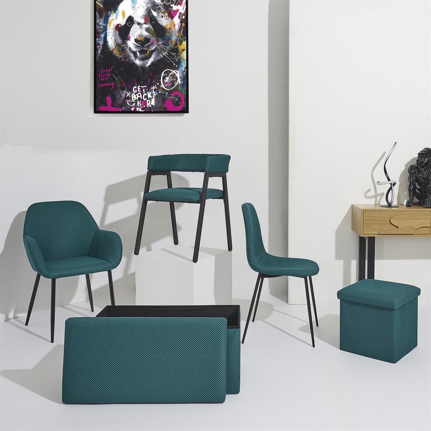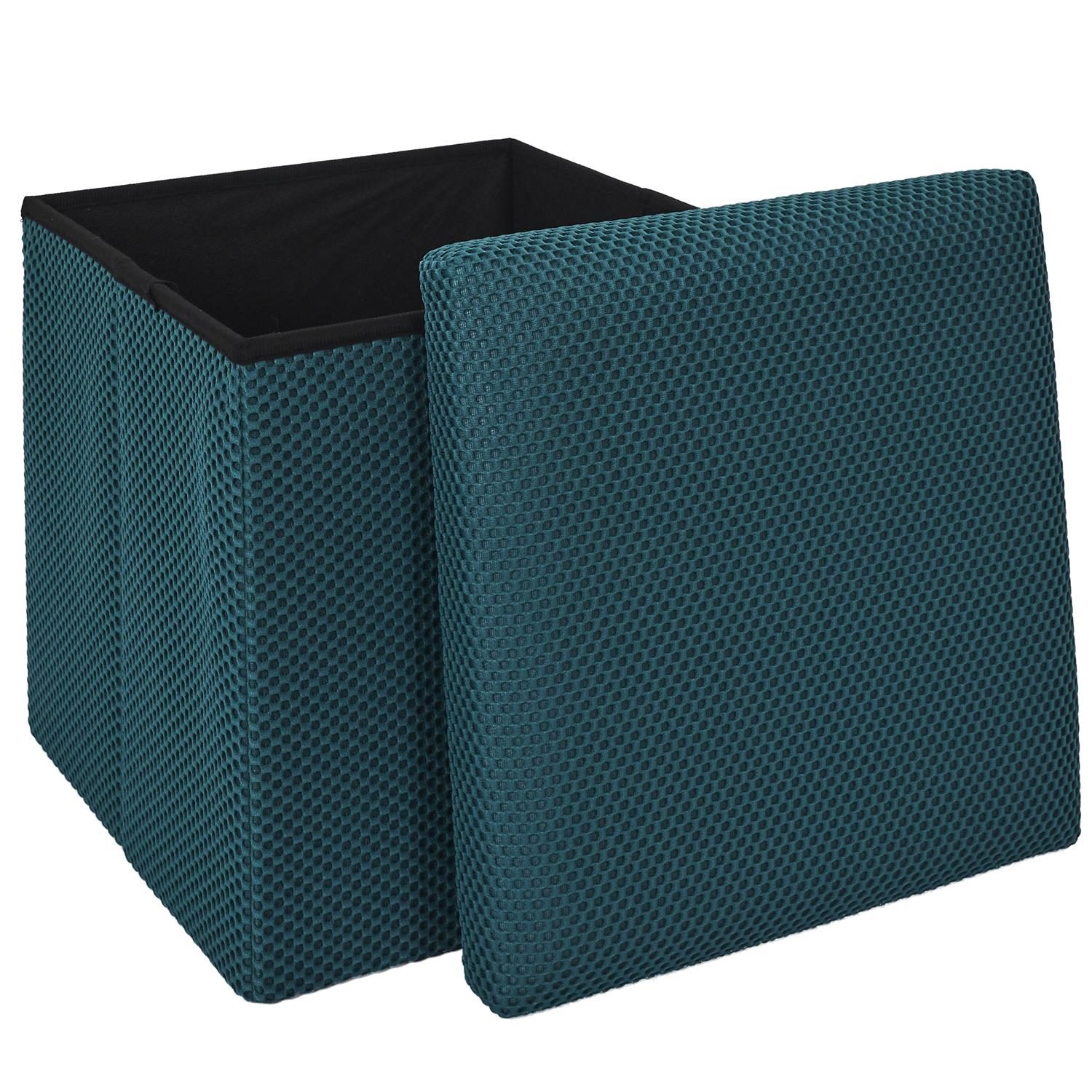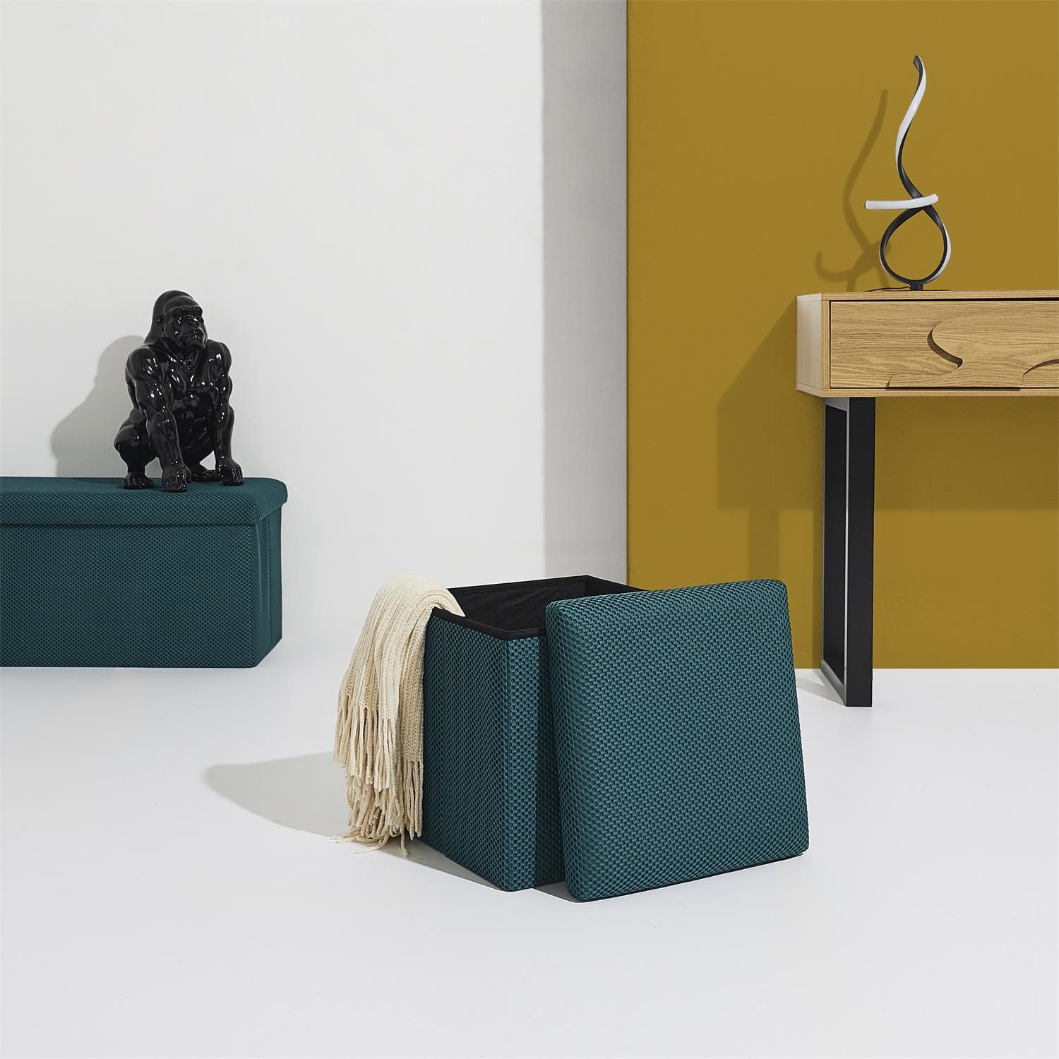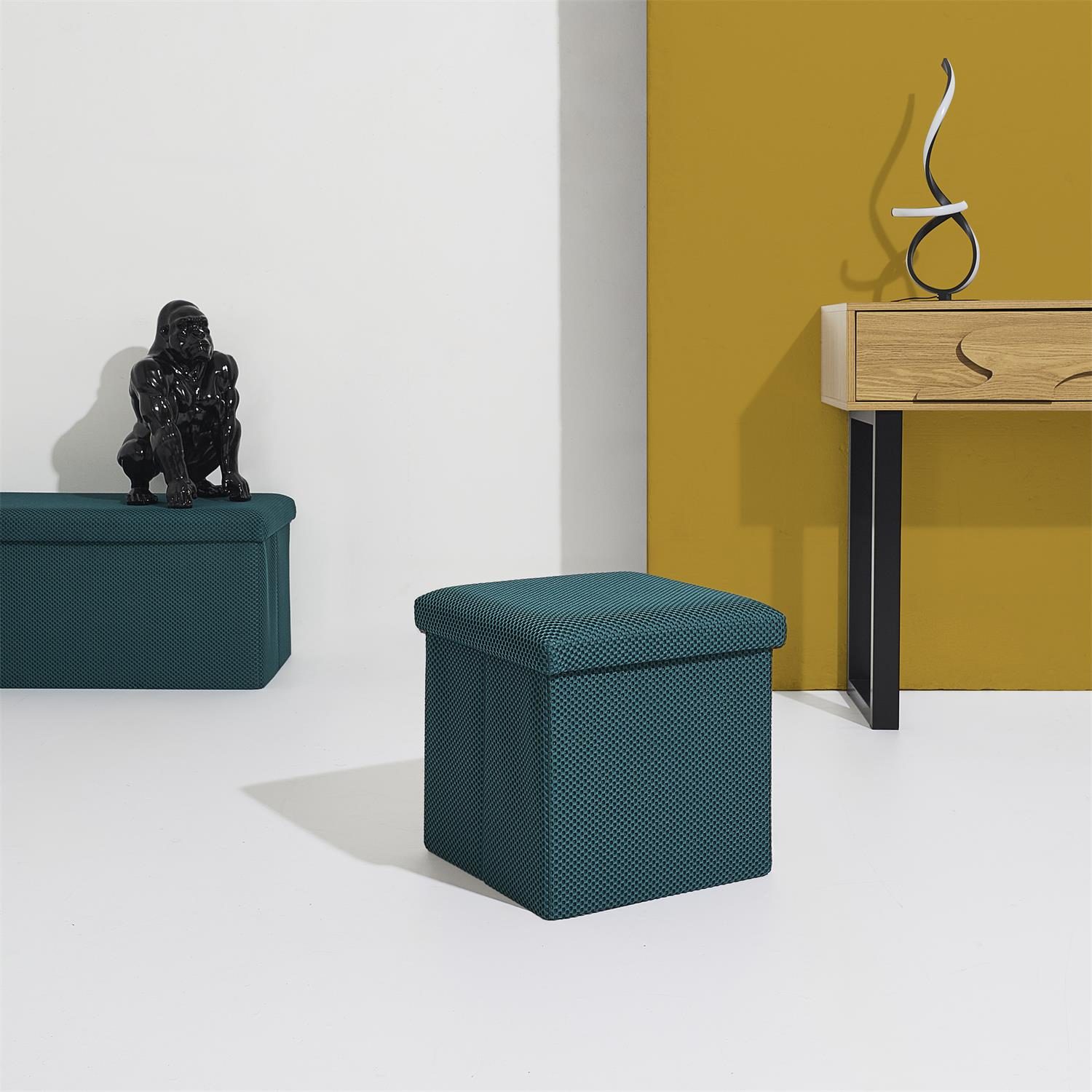 Składana pufa ze schowkiem to must have każdego mieszkania studenta lub osób, które potrzebują dodatkowego siedziska oraz miejsca do przechowywania. Pufa wykonana ze stelaża z wytrzymałej płyty MDF, która gwarantuje maksymalne dopuszczalne obciążenie mebla aż do 110kg. Pufę można złożyć gdy jej nie używamy. Po rozłożeniu natomiast daje nam sporo miejsca do przechowywania zarówno mniejszych rzeczy jak i sporych takich jak koce, buty lub książki. Pufa ozdobiona została ciekawą trójwymiarową tkaniną. Tkanina 100% poliester.