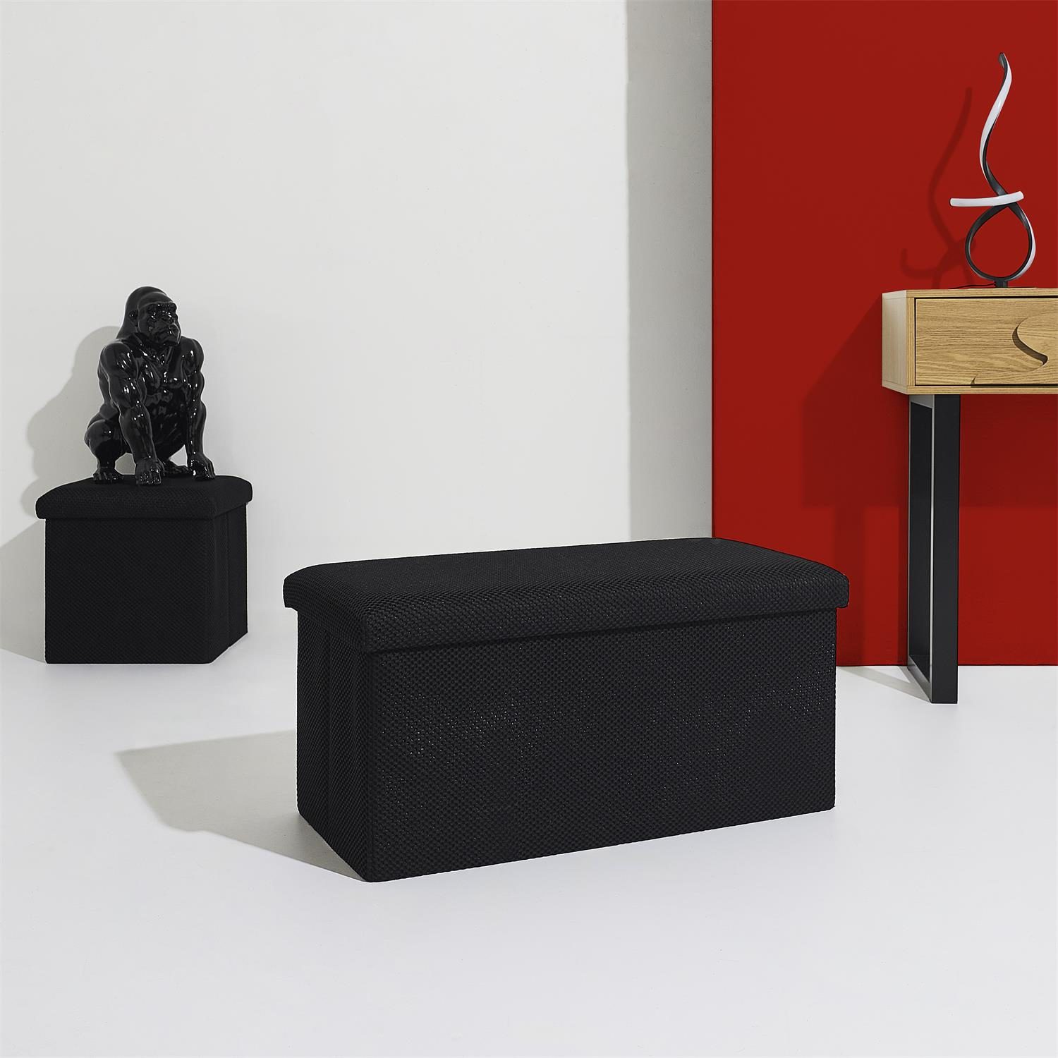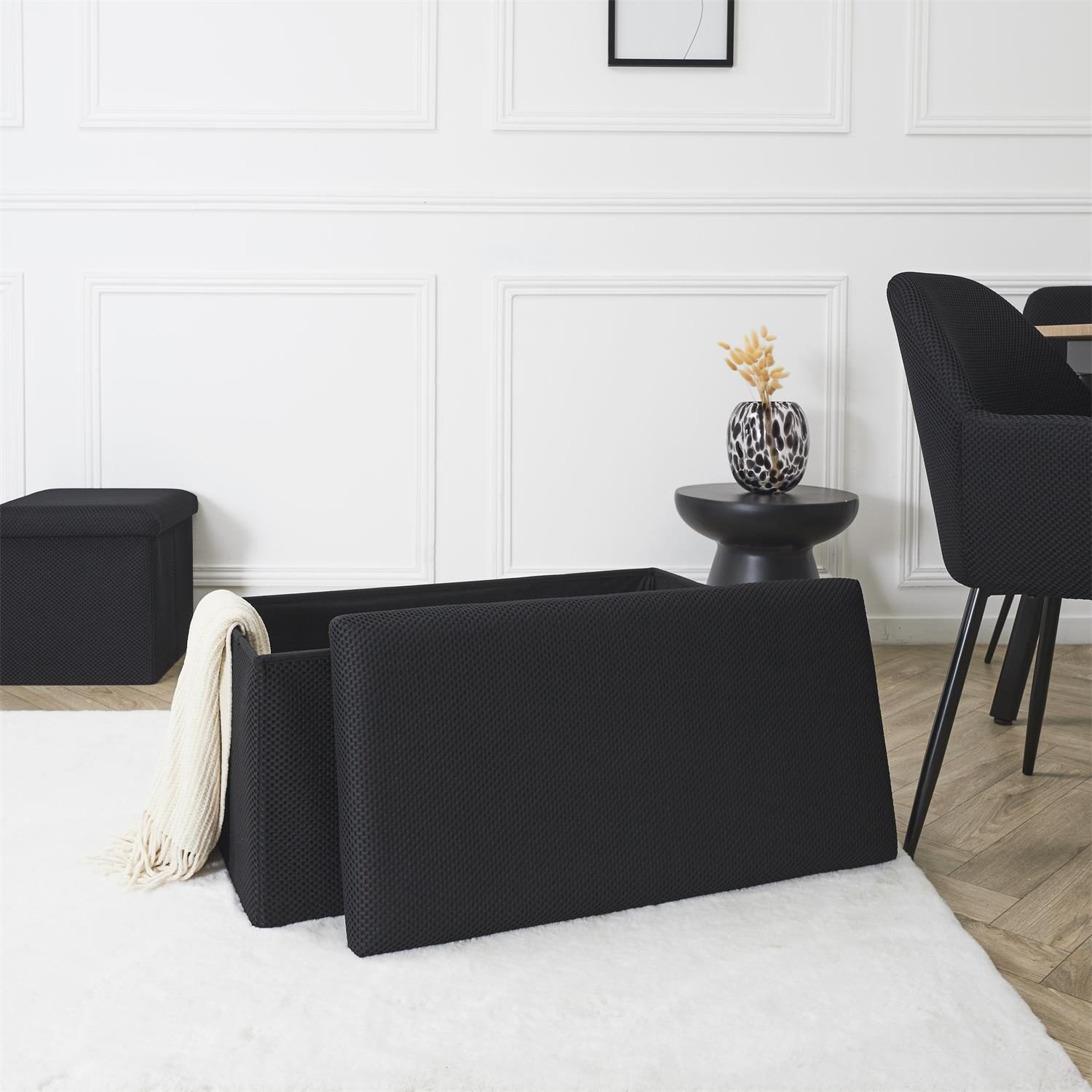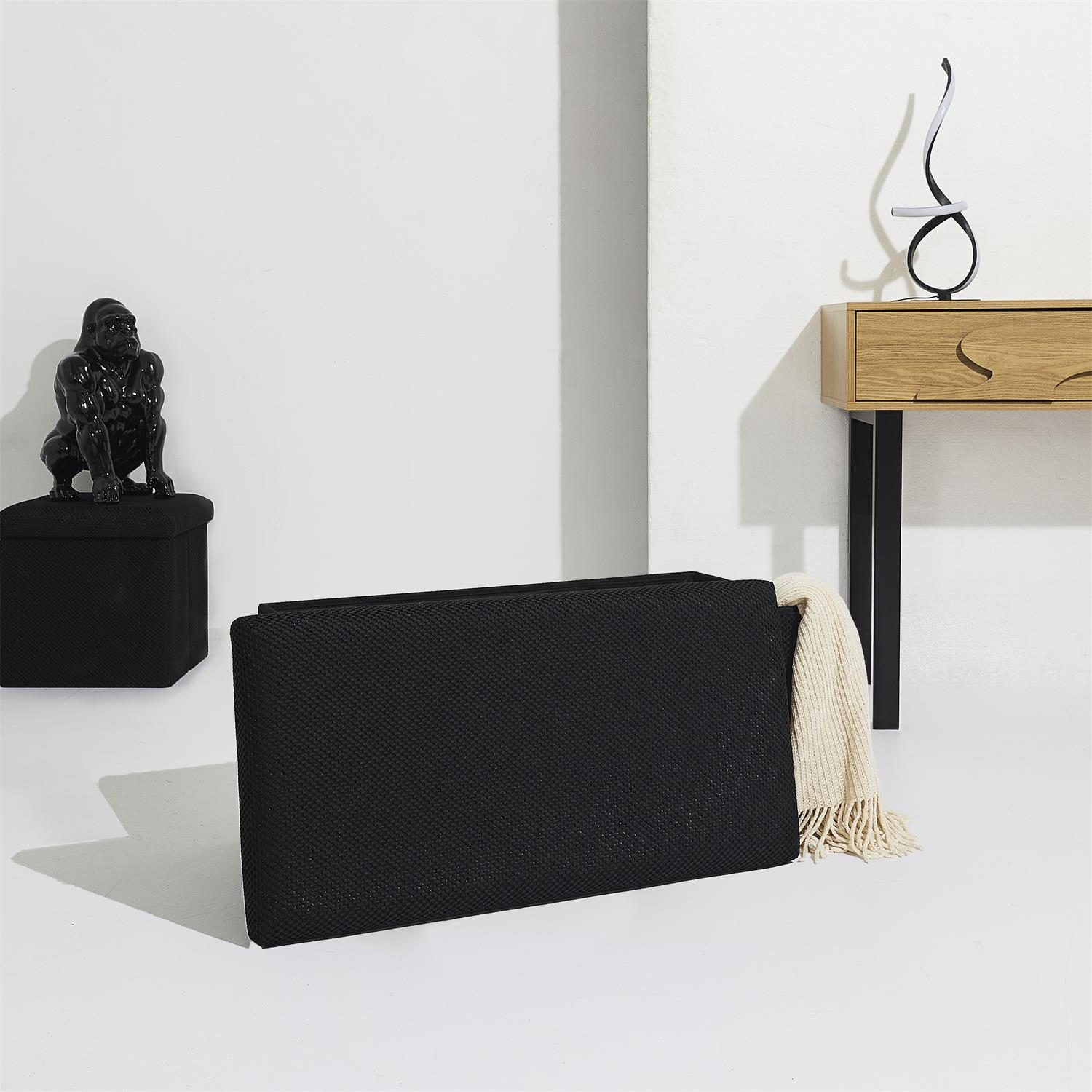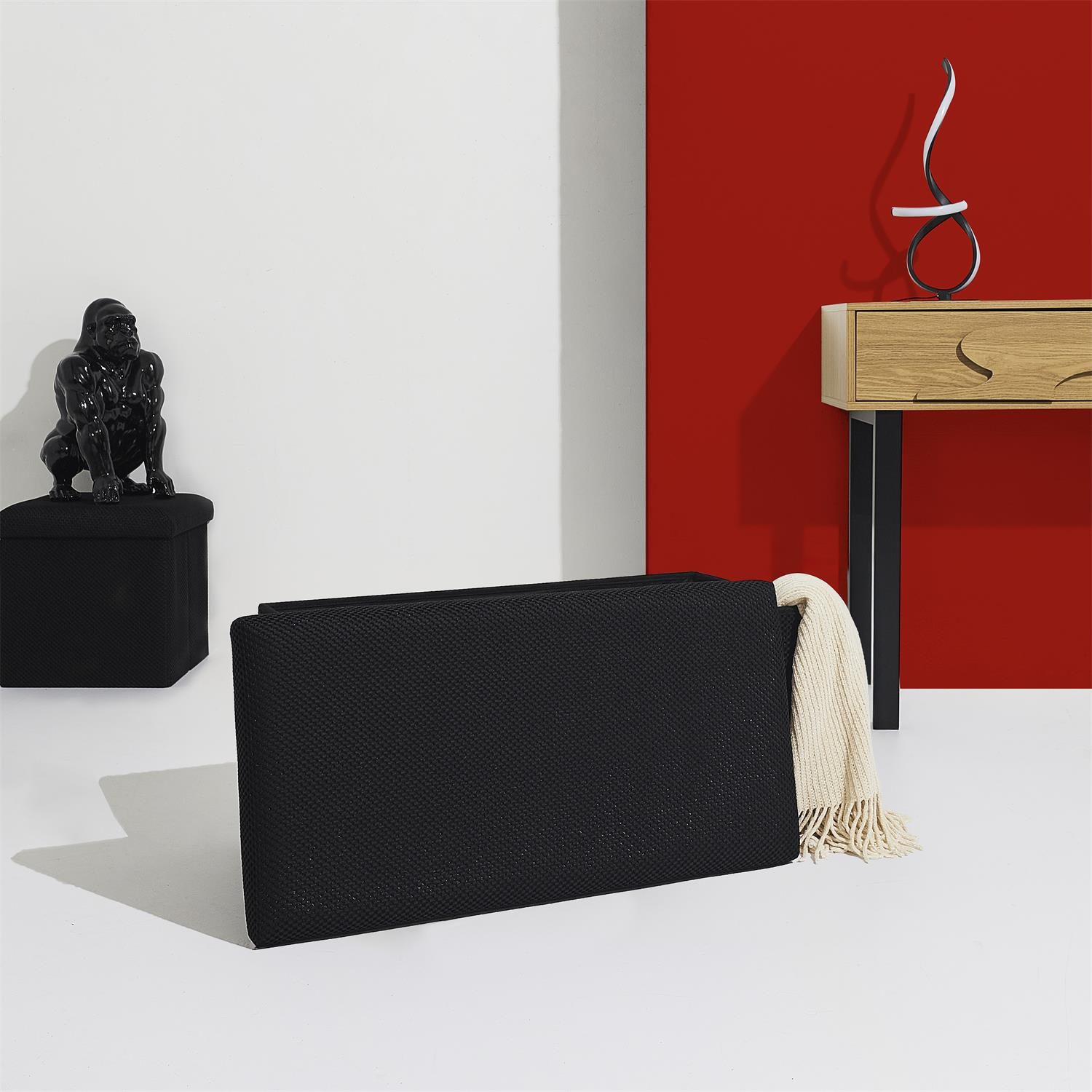 Składana pufa ze schowkiem to must have każdego mieszkania studenta lub osób, które potrzebują dodatkowego siedziska oraz miejsca do przechowywania. Pufa wykonana ze stelaża z wytrzymałej płyty MDF, która gwarantuje maksymalne dopuszczalne obciążenie mebla aż do 110kg. Pufę można złożyć gdy jej nie używamy. Po rozłożeniu natomiast daje nam sporo miejsca do przechowywania zarówno mniejszych rzeczy jak i sporych takich jak koce, buty lub książki. Pufa ozdobiona została ciekawą trójwymiarową tkaniną. Tkanina 100% poliester.
