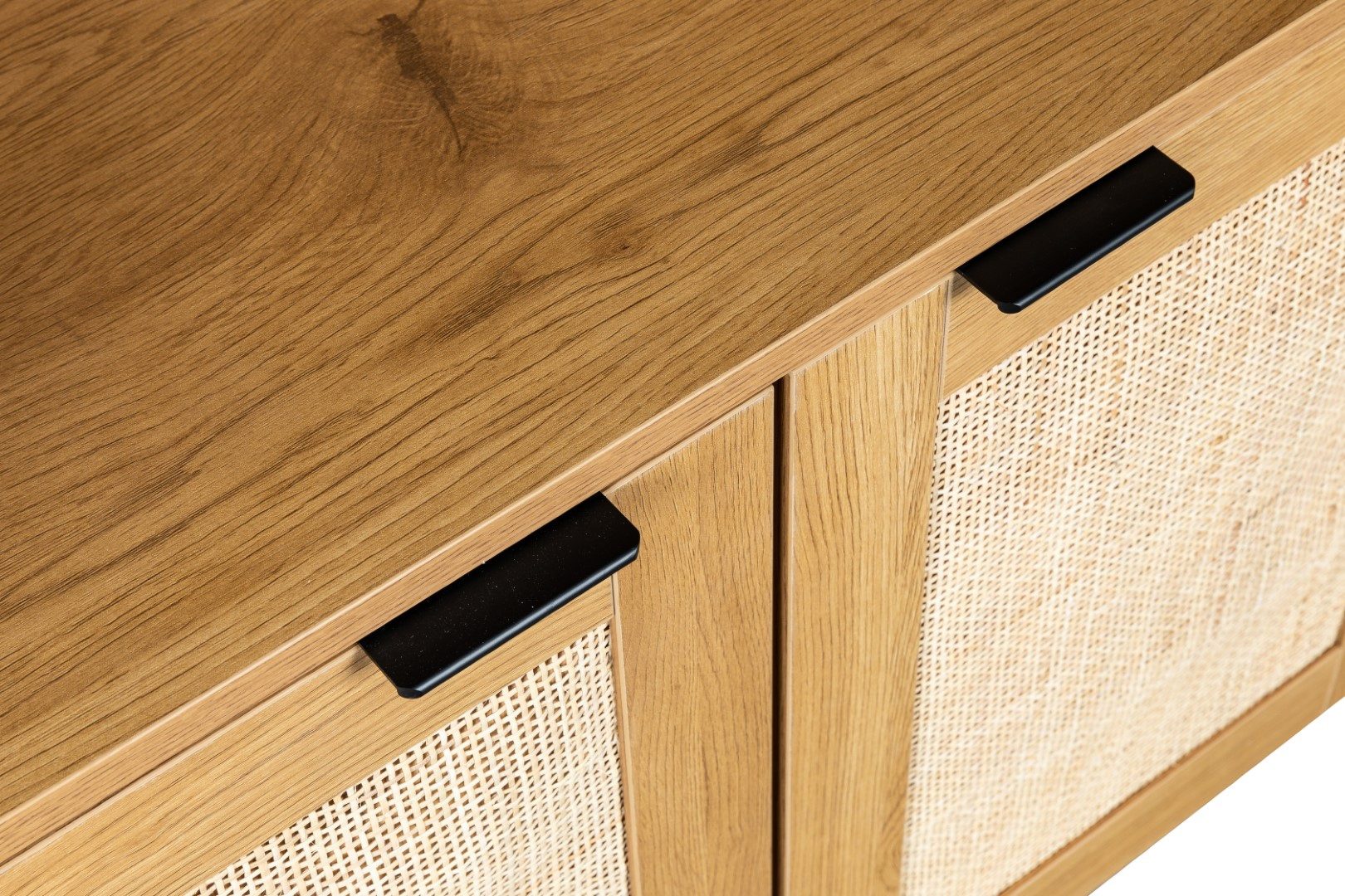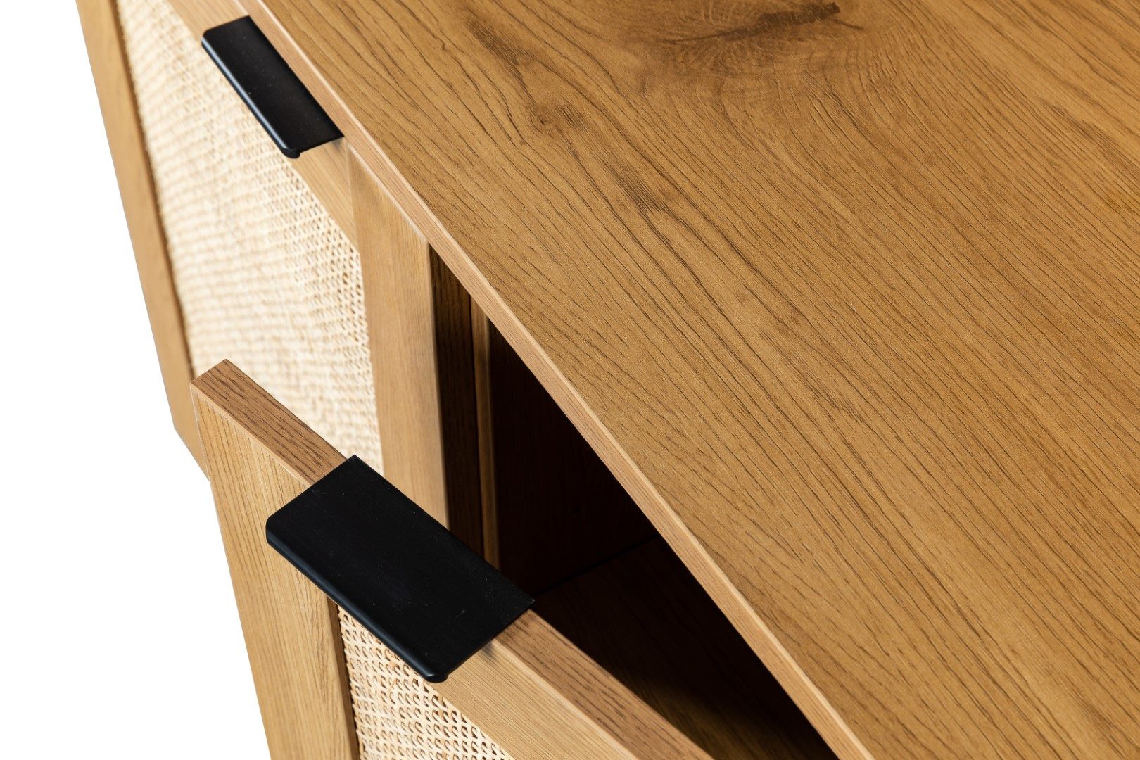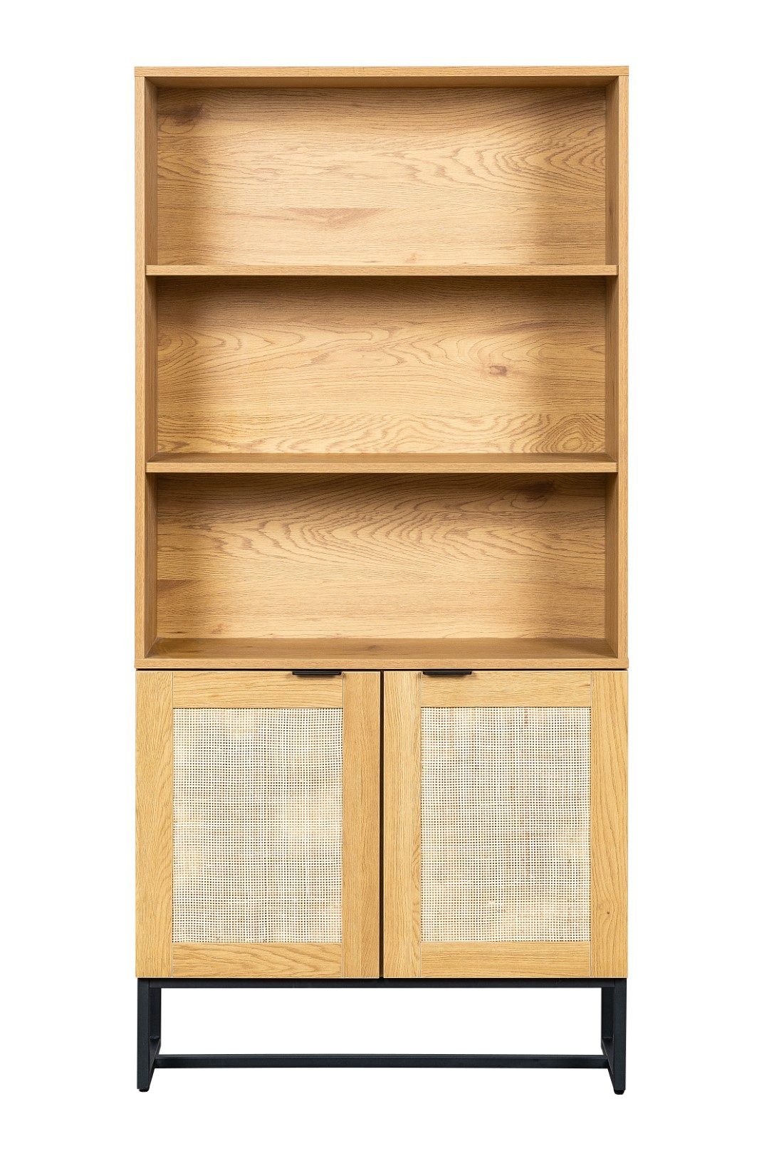 Regał z półkami w stylu boho z rattanowymi frontami to idealny mebel do sypialni lub salonu w naturalnych, jasnych kolorach. Regał z trzema półkami i szafką z dwoma frontami pozwoli na przechowywanie nie tylko ubrania, ale również talerzy, sztućców, obrusów i innych przedmiotów. Regał stoi stabilnie dzięki metalowej podstawie. Nogi szafki Capri zostały polakierowane proszkowo na czarno. Dębowa okleina, którą została wykończona szafka, niezwykle dokładnie imituje naturalny kolor oraz teksturę drewna. Swoją wytrzymałość Regał Capri zawdzięcza trwałym materiałom jak płyta MDF, z której wykonany został korpus i półki oraz metal użyty na podstawie. Fronty szafki w środku wykonane zostały z naturalnego rattanu. Naturalny rattan to nie tylko niewiarygodnie dobrze wyglądający materiał. Rattan przede wszystkim gwarantuje cyrkulację powietrza w komodzie.Wymiary opakowana: 112×39.5×18.5cm61x47.5x16cm