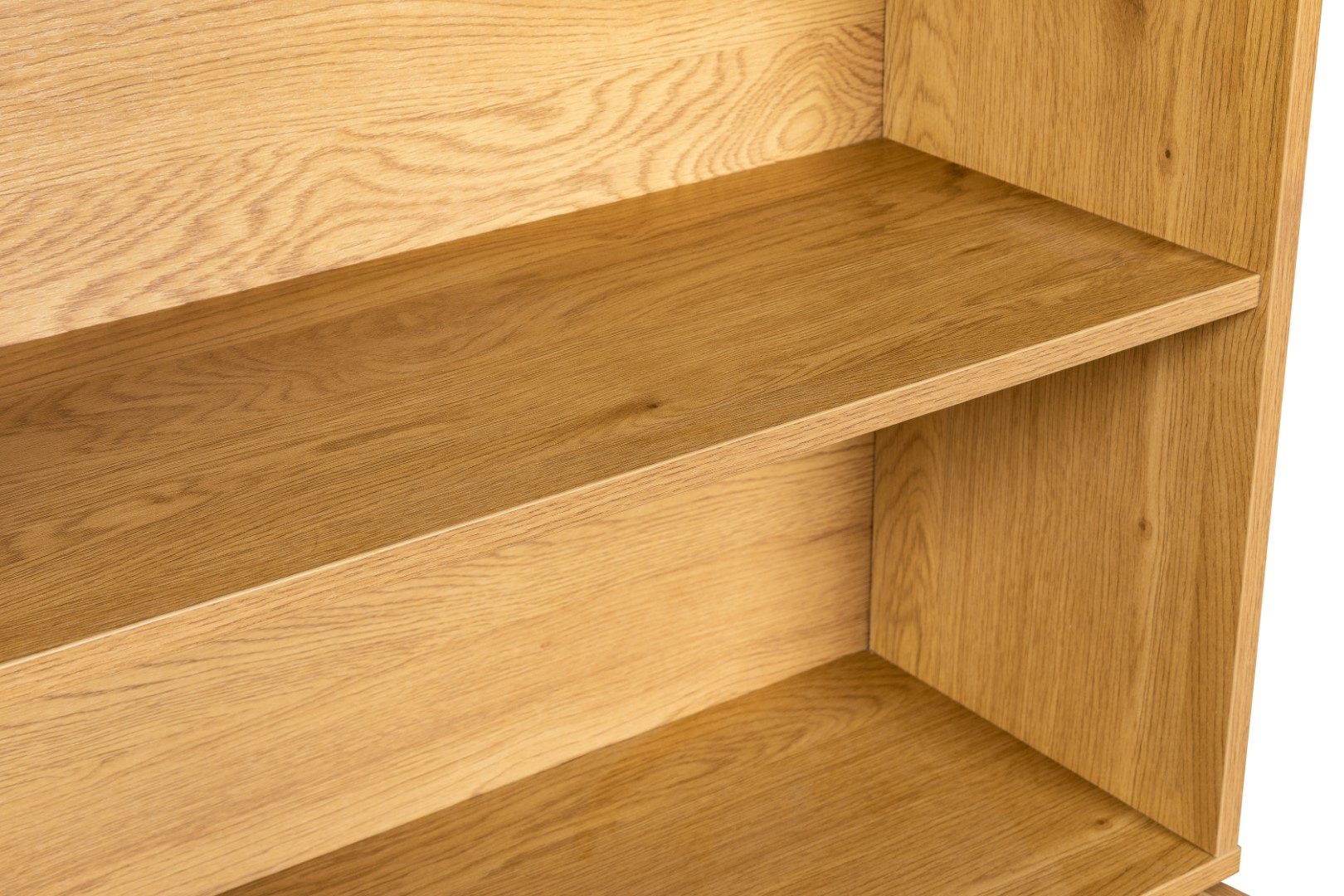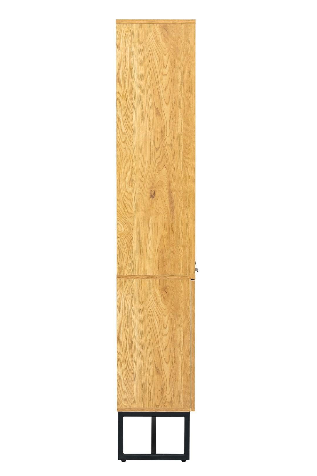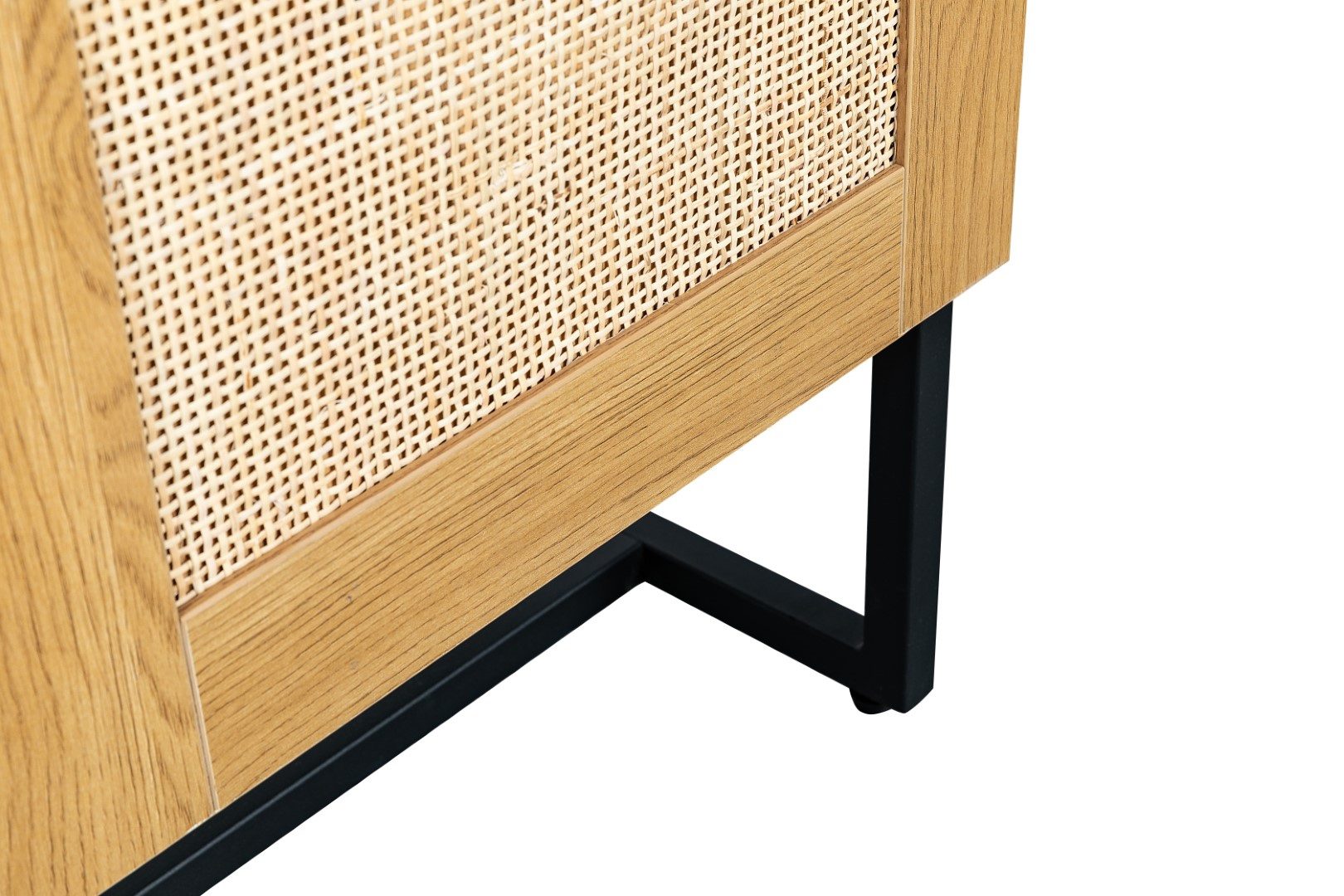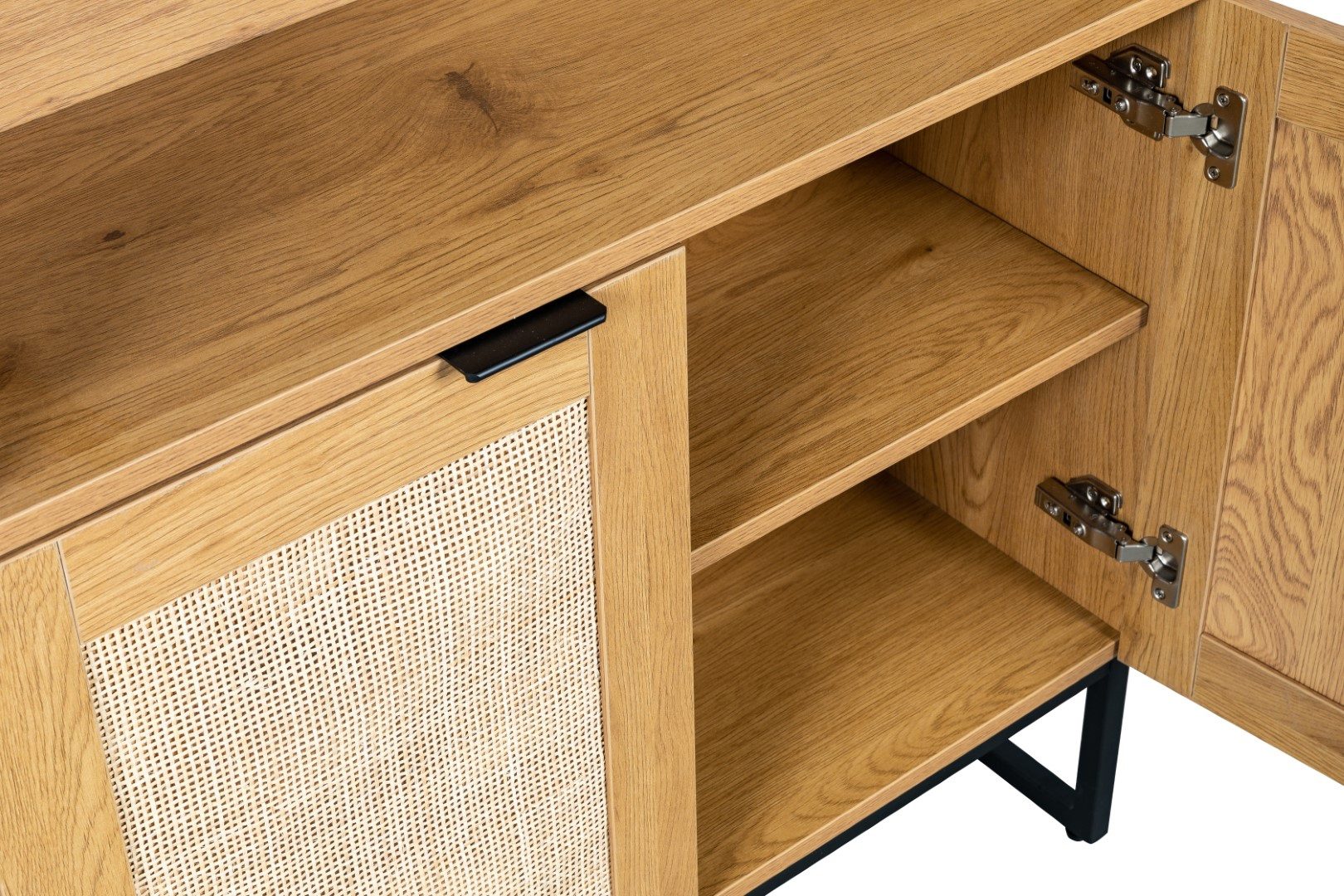 Regał z półkami w stylu boho z rattanowymi frontami to idealny mebel do sypialni lub salonu w naturalnych, jasnych kolorach. Regał z trzema półkami i szafką z dwoma frontami pozwoli na przechowywanie nie tylko ubrania, ale również talerzy, sztućców, obrusów i innych przedmiotów. Regał stoi stabilnie dzięki metalowej podstawie. Nogi szafki Capri zostały polakierowane proszkowo na czarno. Dębowa okleina, którą została wykończona szafka, niezwykle dokładnie imituje naturalny kolor oraz teksturę drewna. Swoją wytrzymałość Regał Capri zawdzięcza trwałym materiałom jak płyta MDF, z której wykonany został korpus i półki oraz metal użyty na podstawie. Fronty szafki w środku wykonane zostały z naturalnego rattanu. Naturalny rattan to nie tylko niewiarygodnie dobrze wyglądający materiał. Rattan przede wszystkim gwarantuje cyrkulację powietrza w komodzie.Wymiary opakowana: 112×39.5×18.5cm61x47.5x16cm