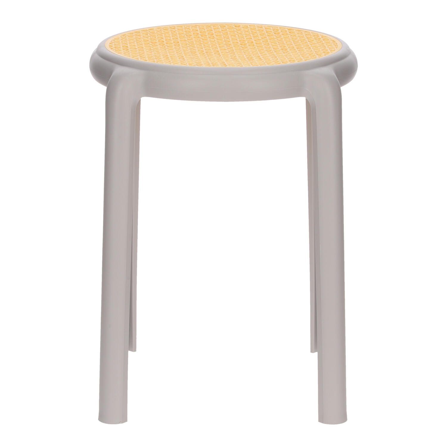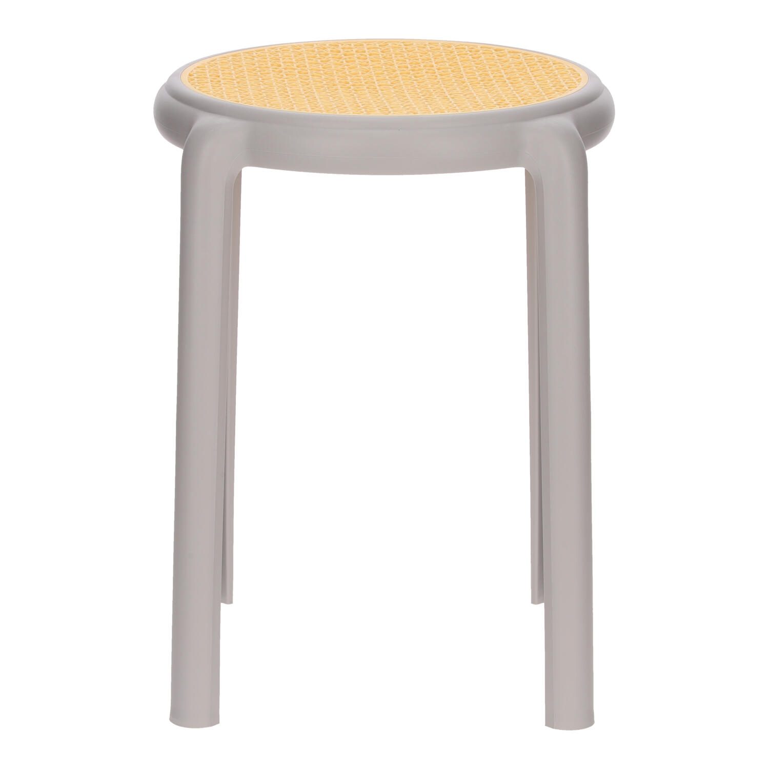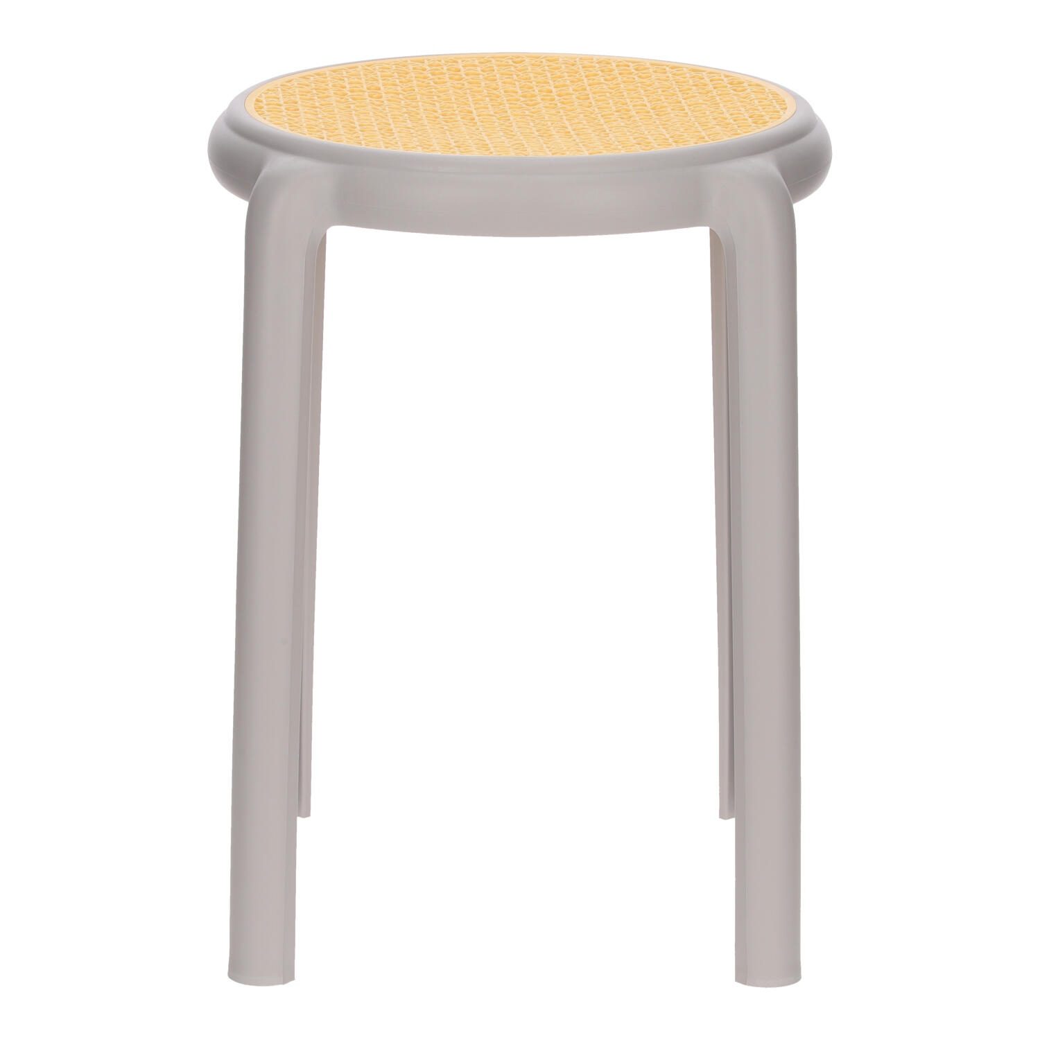 Stołek wykonany w całości z polipropylenu. Siedzisko imitujące plecionkę wiedeńską sprawdzi się przede wszystkim w kuchni. Łatwy w czyszczeniu stołek jest odporny na wilgoć oraz zabrudzenia. Stołek sprawdzi się w kuchni lub na balkonie. Średnica samego siedziska: 33cm. Średnica nóżek: 3,5cm Max. obciążenie 100kg Nie wymaga montażu Odporny na wilgoć stołej nadaje się do użytku zewnętrznego. Należy jednak chronić go przed nadmiernymi promieniami słonecznymi. Stołek sztapluje się