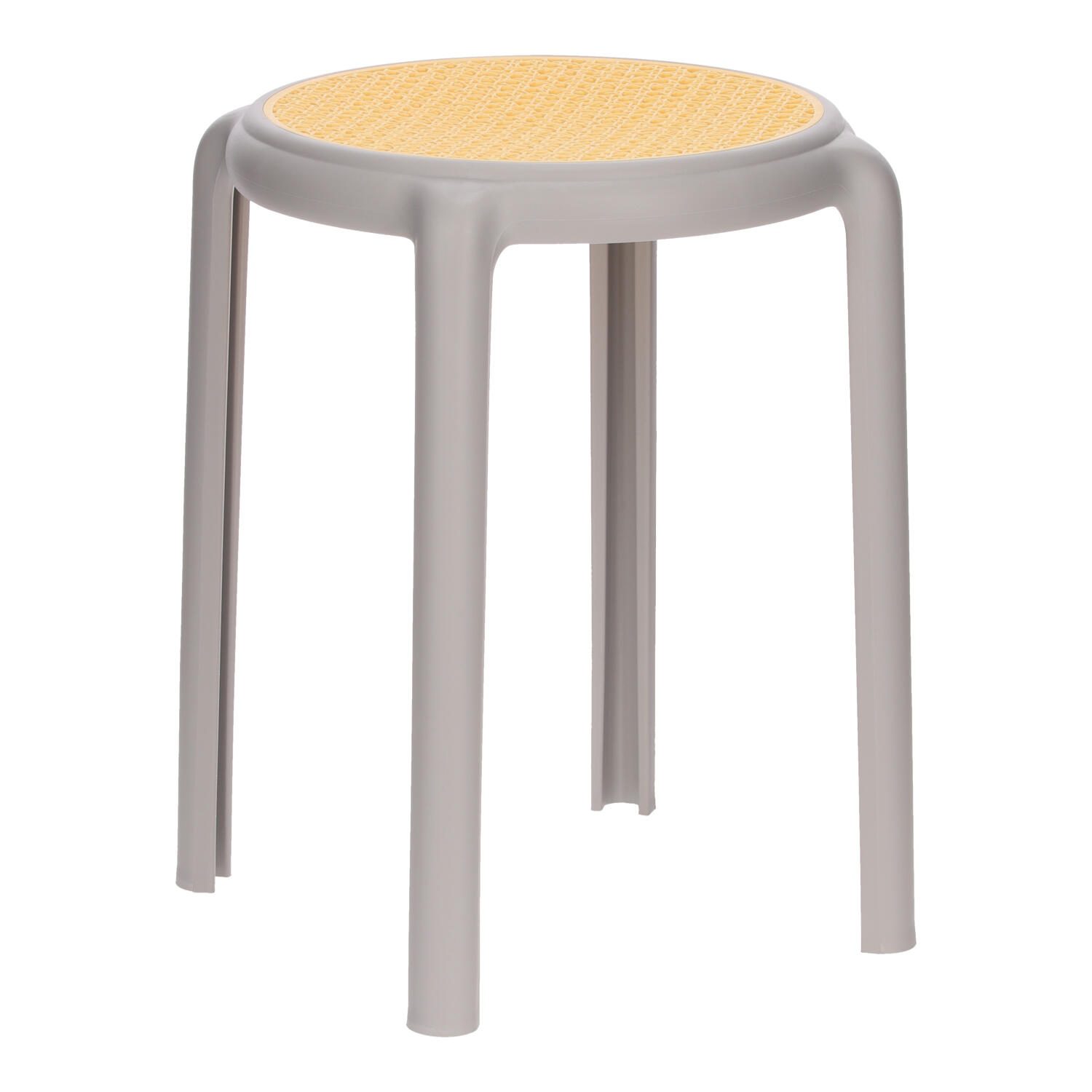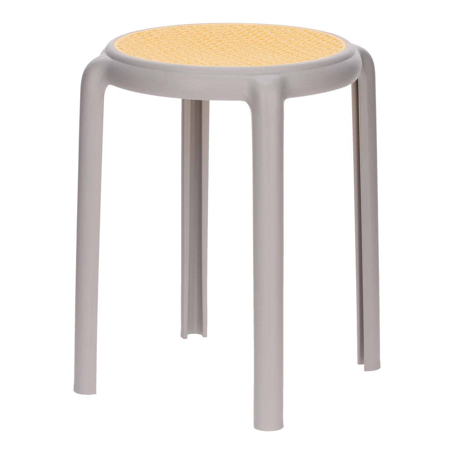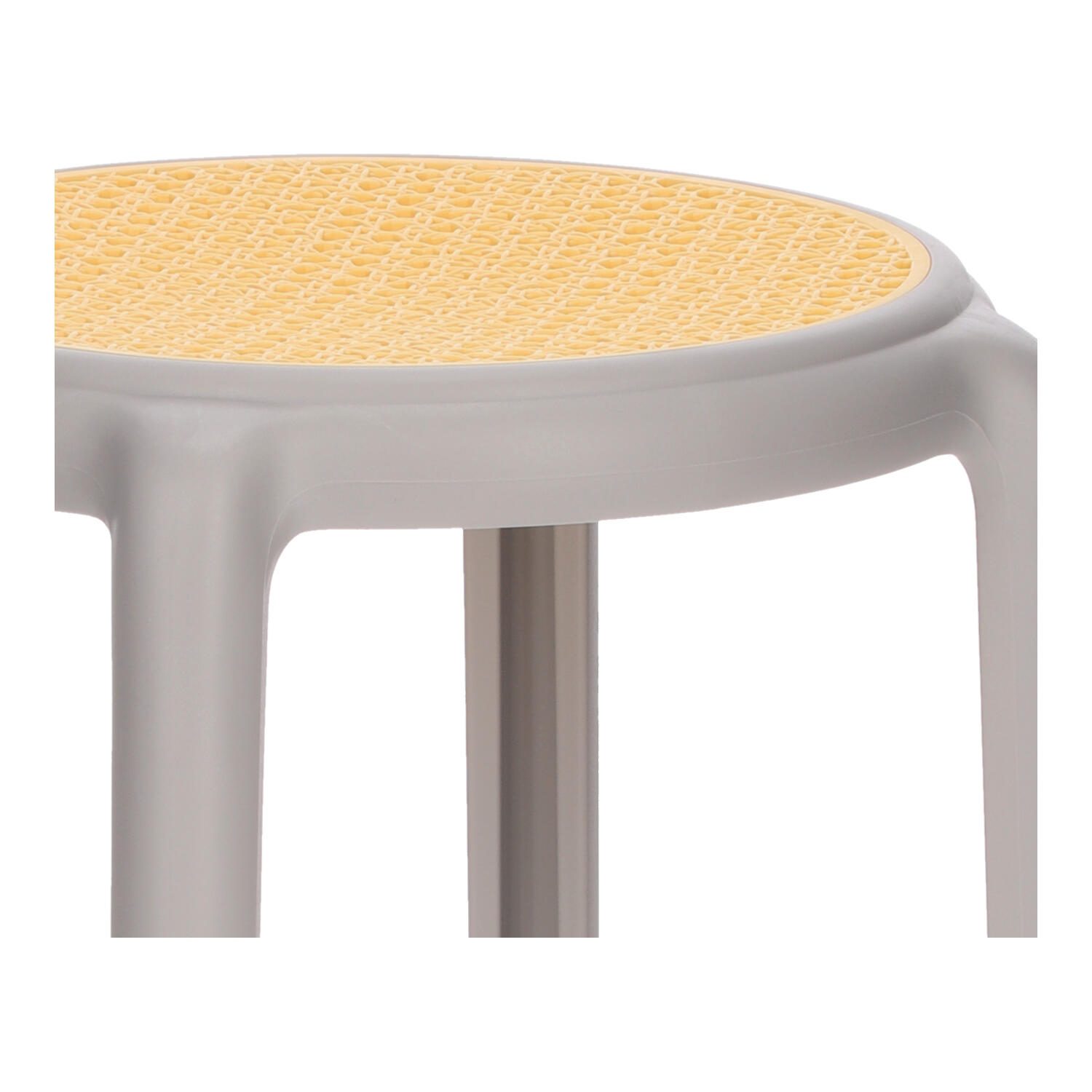 Stołek wykonany w całości z polipropylenu. Siedzisko imitujące plecionkę wiedeńską sprawdzi się przede wszystkim w kuchni. Łatwy w czyszczeniu stołek jest odporny na wilgoć oraz zabrudzenia. Stołek sprawdzi się w kuchni lub na balkonie. Średnica samego siedziska: 33cm. Średnica nóżek: 3,5cm Max. obciążenie 100kg Nie wymaga montażu Odporny na wilgoć stołej nadaje się do użytku zewnętrznego. Należy jednak chronić go przed nadmiernymi promieniami słonecznymi. Stołek sztapluje się
