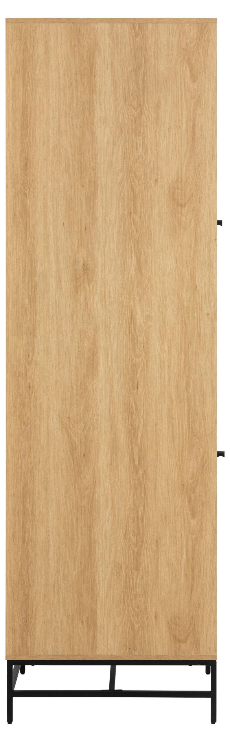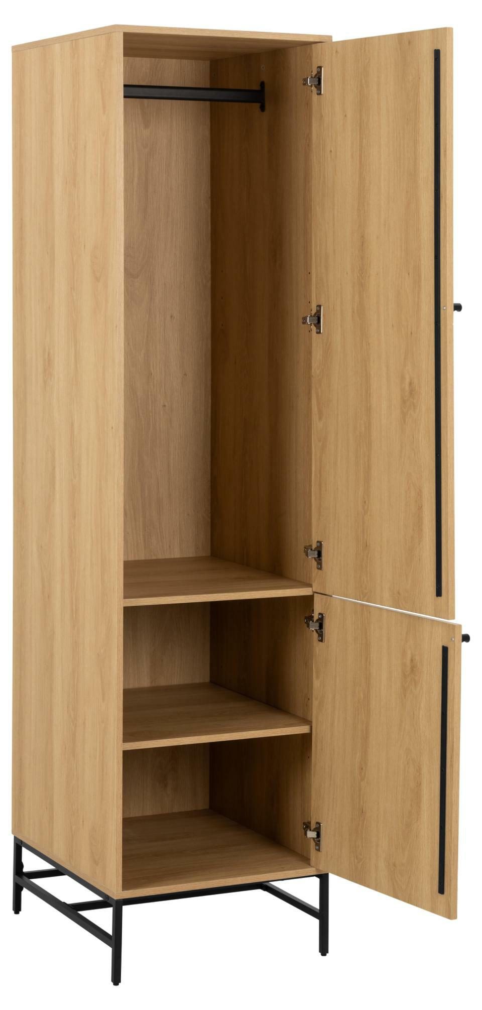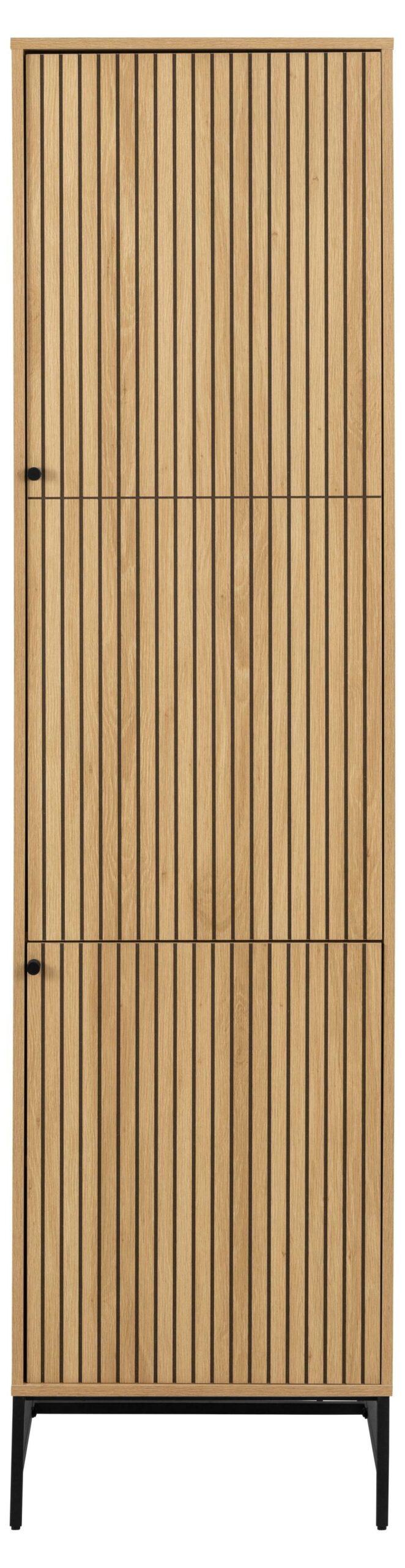 Szafa o dębowym wyglądzie z lamelowym frontem wie, jak przyciągnąć uwagę. Dzięki lamelowanym drzwiom ma dobrze wyważony wygląd, nadając jej ciekawy wygląd. Dzięki 2 regulowanym półkom i drążkowi na ubrania oferuje dużo miejsca do przechowywania, a łatwa w pielęgnacji powierzchnia zwiększa jej praktyczność.Główne cechy: Szafa z 2 drzwiami z frontami lamelowymi. Wyposażona w 2 regulowane półki i 1 drążek na ubrania Łatwa w pielęgnacji powierzchnia o wyglądzie dębu. Stalowa podstawa malowana proszkowo na czarno i o wysokości 18cm. Certyfikat FSC. Zaprojektowany przez projektanta Lasse Cha Pedersena.Waga szafy: 51kgWymaga montażu.Wymiary kartonów: 133x61x8cm, waga 17kg, 16x193x72cm, waga: 39kg