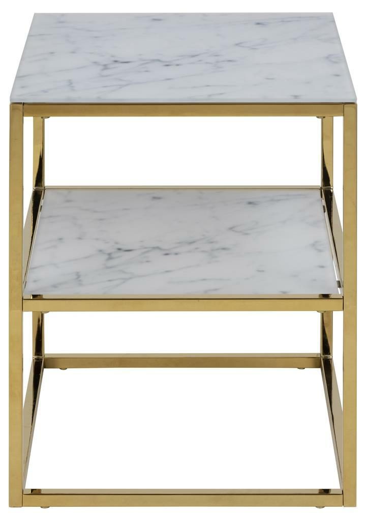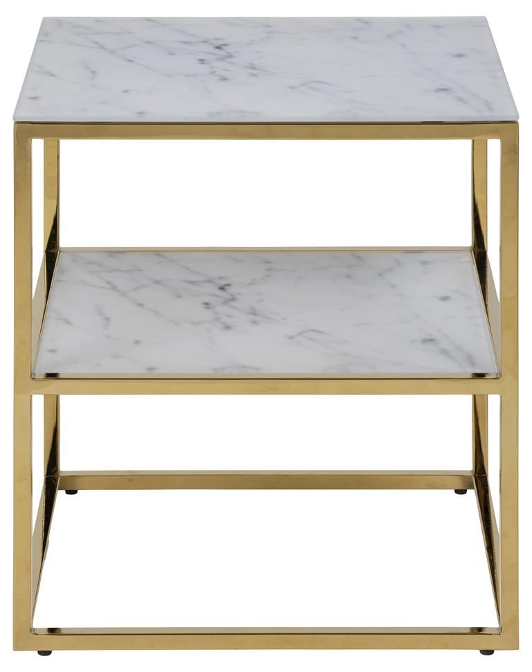 Szafka nocna Alisma w ponadczasowym stylu glamour. Posiada szkielet z chromowanego metalu w kolorze złotym oraz kwadratowy blat i półkę ze szkła pokryte wzorem imitującym biały marmur. Od spodu szafka została zabezpieczona nakładkami z tworzywa. Szafka nicna Alisma to kwintesencja elegancji. Ilość kartonów: 1 Wymiary kartonów: 54,5x48x11,5cm Waga kartonów: 9,3kg