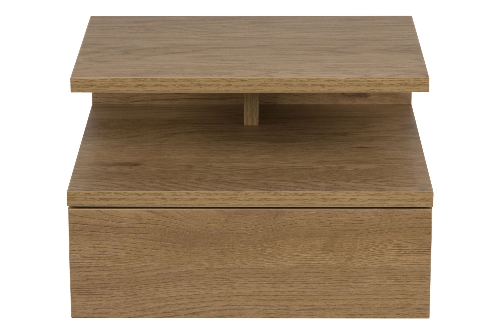 Szafka Ashlan doskonale nada się jako szafka nocna. Jej minimalistyczny kształt i geometria sprawiają że doskonale odnajdzie się w nowoczesnej sypialni ale również salonie. Szafka wykonana została z płyty MDF wykończonej laminatem z drewna dzikiego dębu. Szafkę Ashlan można postawić koło łóżka ale również bez mniejszego problemu powiesić na ścianie. Szuflada o wymiarach 26,5cmx23,5cm pomieści drobne przedmioty a przestrzeń między blatami sprawdzi się jako półka na książki czy ulubioną gazetę.