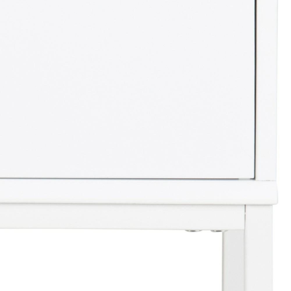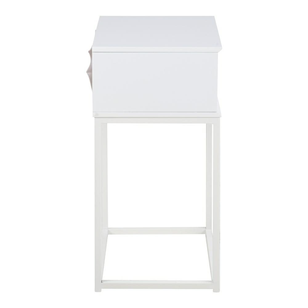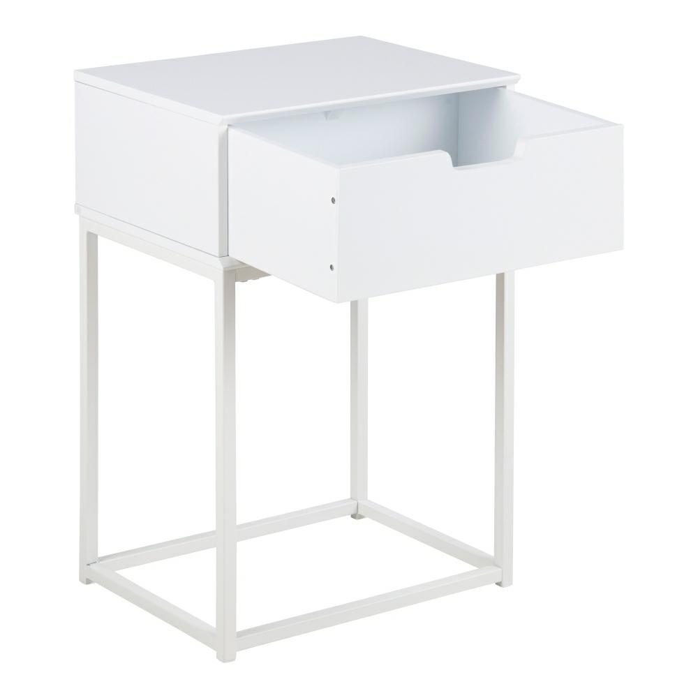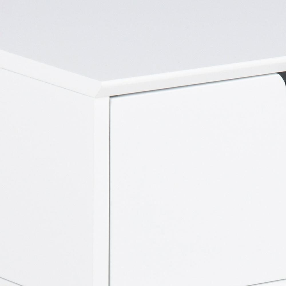 Szafka nocna Mitra utrzymana w stylu skandynawskim wykonana została z płyty MDF w kolorze białym. Podstawę stanowią nogi wykonane z metalu polakierowanego na buiało.. Całość prezentuje się wyjątkowo subtelnie i nowocześnie. Szafka wyposażona jest w jedną bardzo pojemną szufladę.Waga: 6,5 kg. Wymiary kartonu: 52,3cm x 34,2cm x 10,2cm