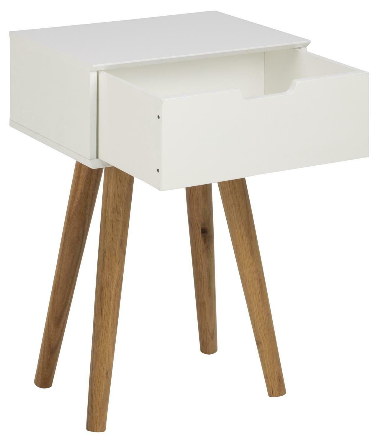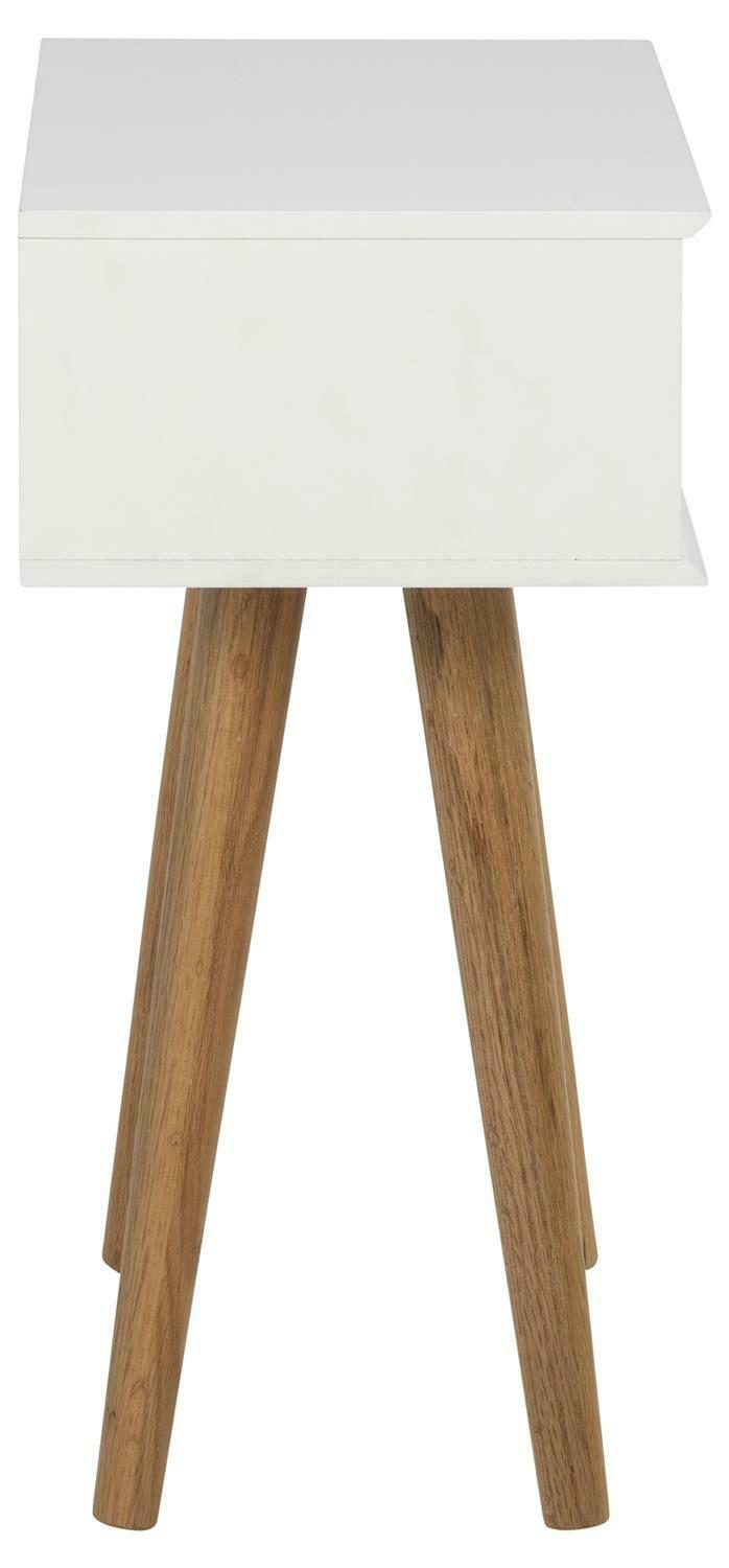 Szafka nocna Mitra utrzymana w stylu skandynawskim wykonana została z płyty MDF w kolorze białym. Podstawę stanowią nogi wykonane z drewna dębowego. Całość prezentuje się wyjątkowo subtelnie i nowocześnie.
