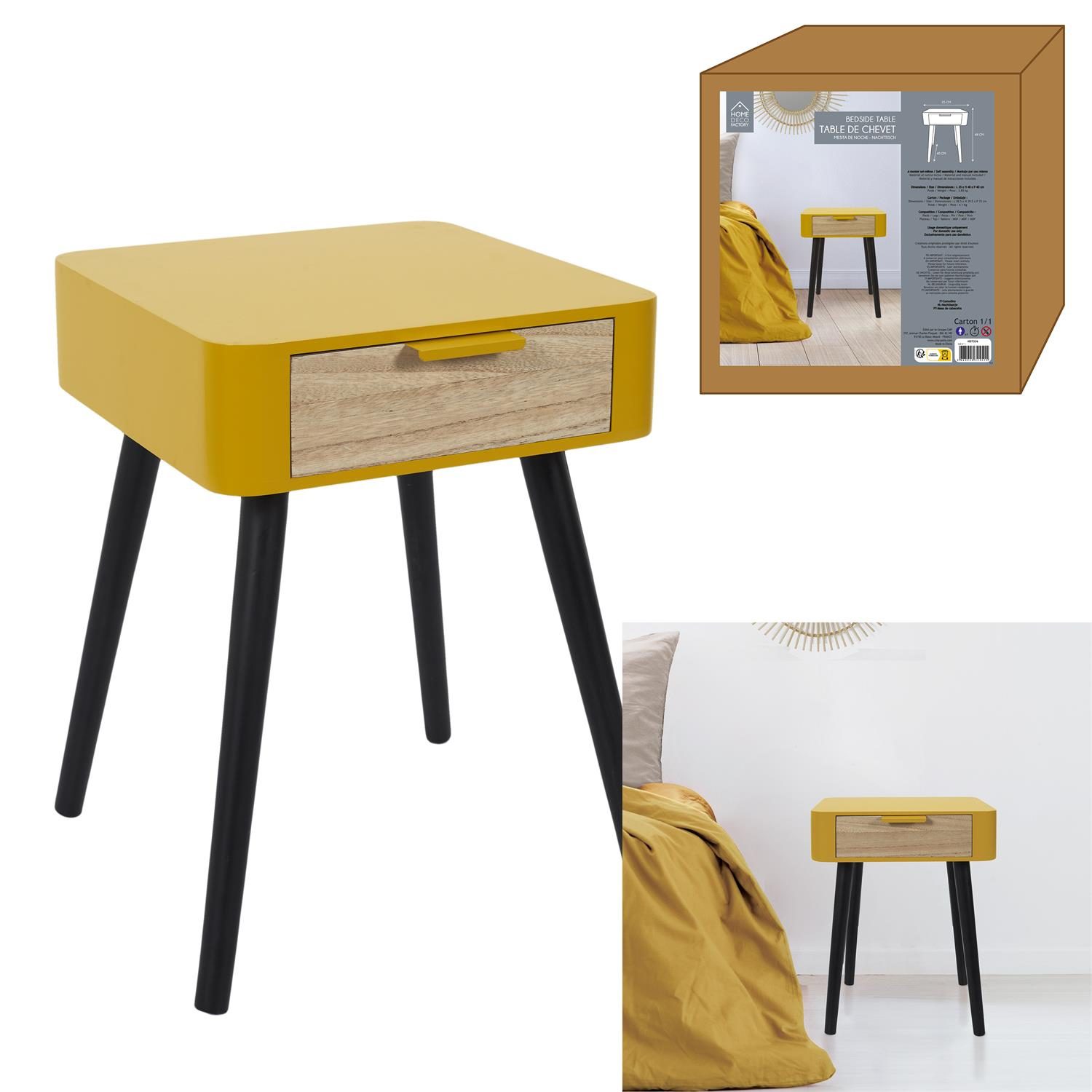 Drewniana szafka nocna Padano to mebel idealny do sypialni w stylu skandynawskim. Szafka nocna na czterech nogach z litego drewna sosnowego pomalowana została na żółto. Korpus szafki został wyprodukowany z mocnej płyty MDF. Szafka posiada pojemną szufladę, której front pokryty został laminatem imitującym drewno. Waga stolika: 3,6 kgWymiary opakowania: 15,00 x 38,50 x 66,00 cm