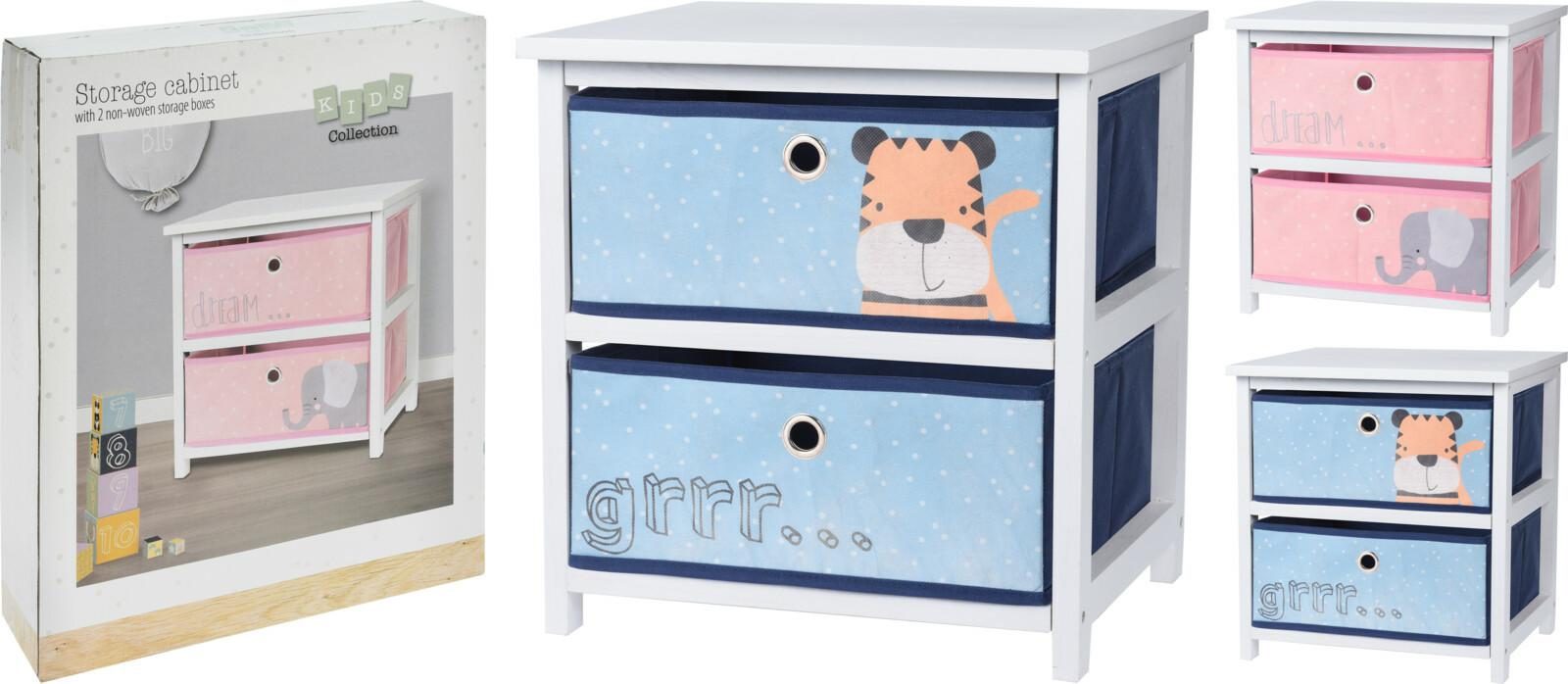 Szafka Oland, wykonana z płyty MDF w białym kolorze wyposażona została w dwie szuflady z tworzywa. Szuflady zostały wykonane ze wzmocnionej tkaniny, która jest łatwa w czyszczeniu. Szafka występuje w trzech kolorach. Szuflady szafki możemy wyjmować i używac jako pudełek na przykłąd na zabawki lub kosmetyki.Wymiary szuflad: 35x30x15 cmTkanina 80g/m2Wymiary opakowania: 35x10x43cm