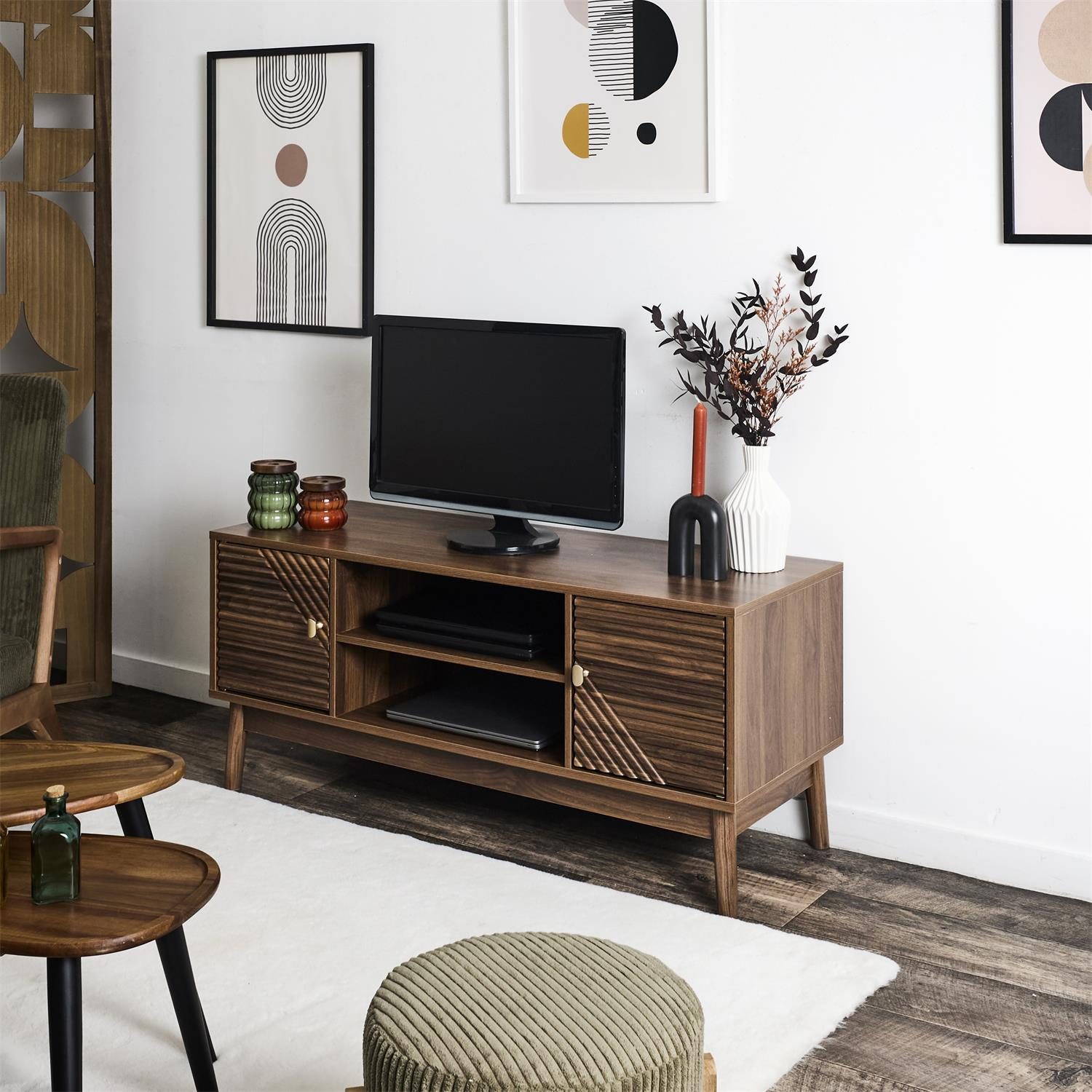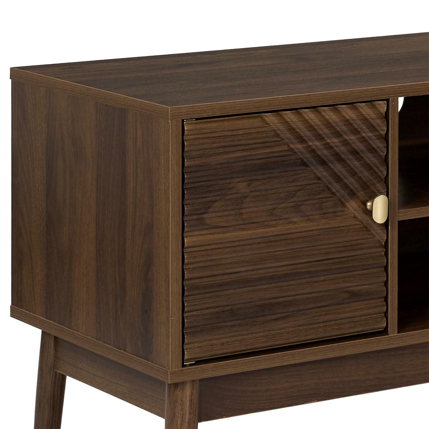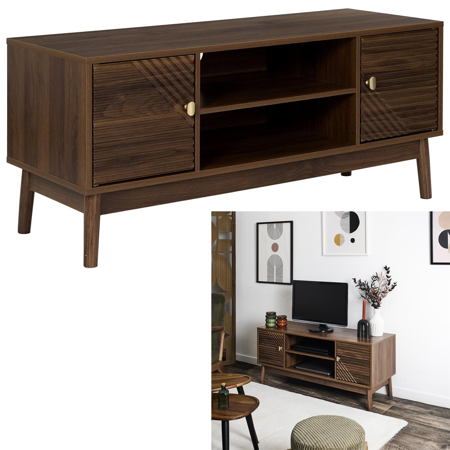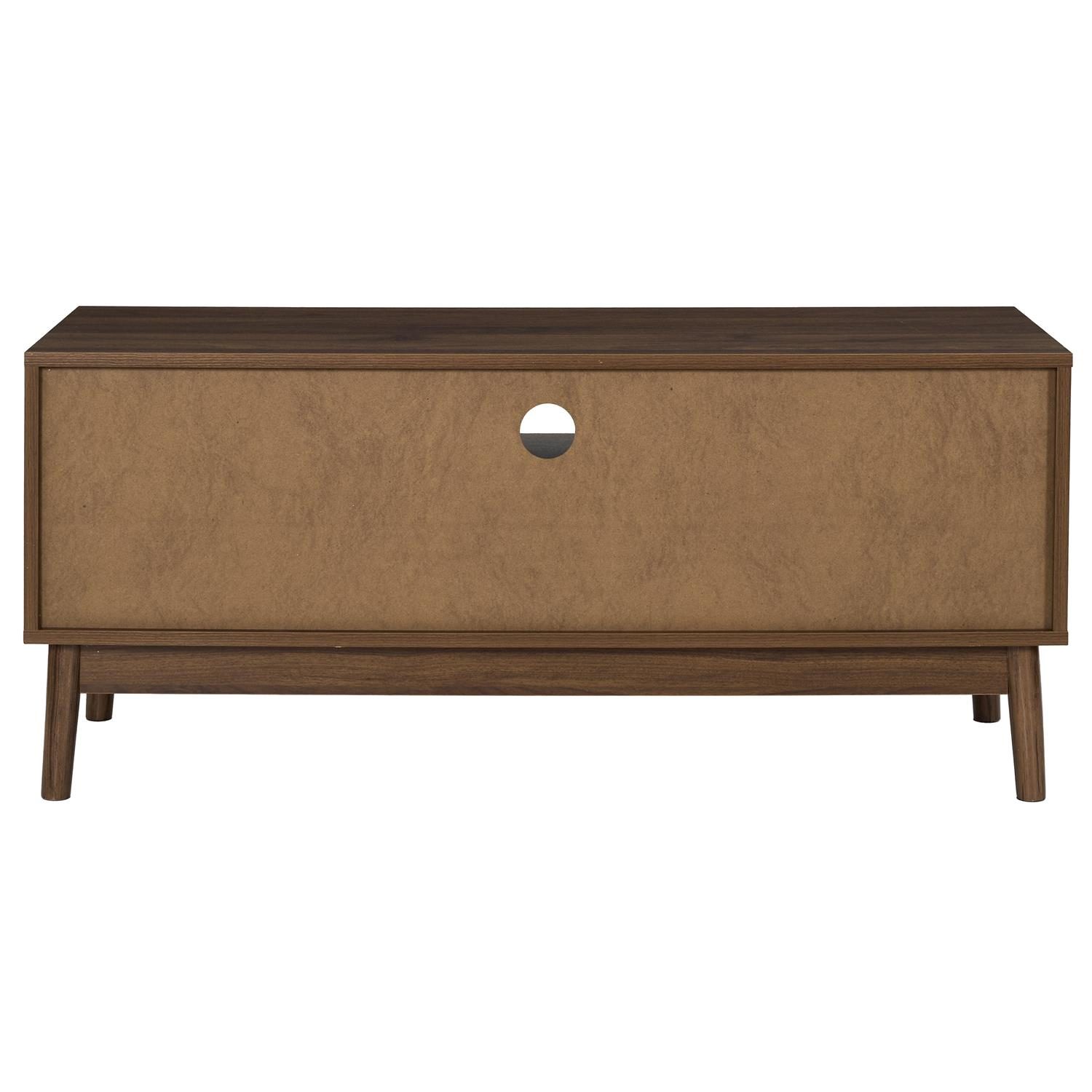 Szafka wymaga montażu Materiał: Płyta MDFw okleinie imitującej orzech. Nogi drewno sosnowe, uchwyty metal. Komoda wyposażona w 2 fronty. Safka wyposazona w otwór na przewody telewizyjne Max. obciążenie mebla 40kg.